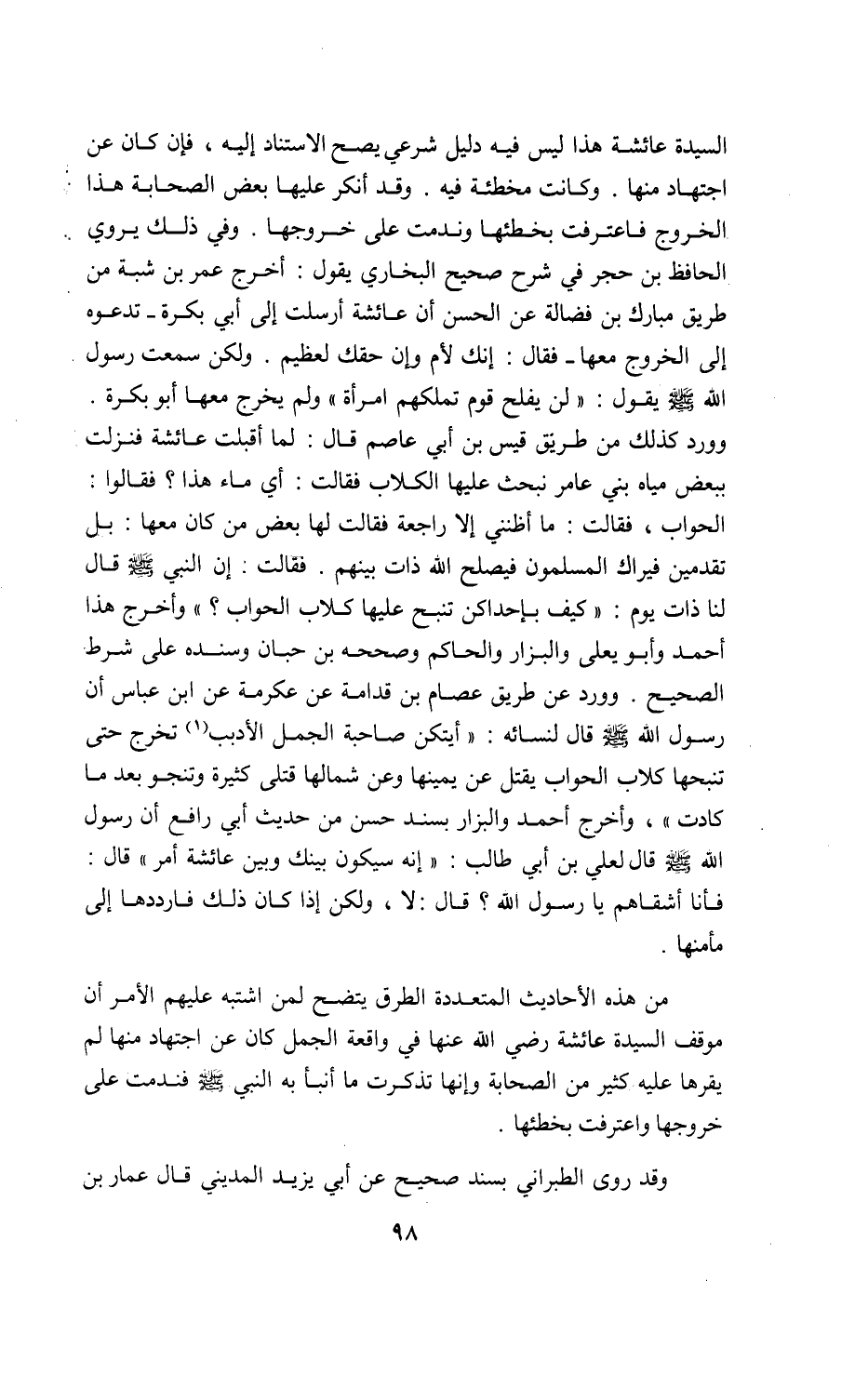 من هذه الأحاديث المتعددة الطرق يتضح لمن اشتبه عليهم الأمر أن موقف السيدة عائشة رضي اللّه عنها في واقعة الجمل كان عن اجتهاد منها لم يقرها عليه كثير من الصحابة وإنها تذكرت ما أنبأ به النبي صلى اللّه عليه وسلم فندمت على خروجها واعترفت بخطئها.