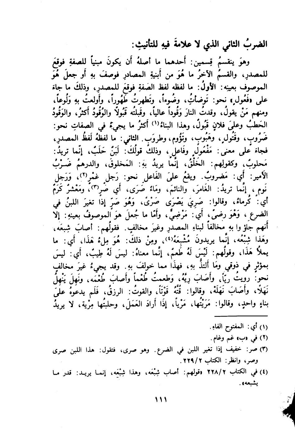 وهوَ ينقسمُ قِسمين: أَحدهما ما أصلهُ أَن يكونَ مبنيًا للصفةِ فوقعَ للمصدرِ والقسمُ الآخرُ ما هُوَ من أَبنيةِ المصادرِ فوصفَ بهِ أَو جعلَ هُوَ الموصوف بعينِه: الأولُ: ما لفظه لفظ الصفةِ فوقعَ للمصدرِ وذلكَ ما جاءَ على "فَعُولٍ" نحو: تَوضأتُ وضُوءًا وتَطهرتُ طَهُورًا وأَولعتُ بهِ وَلُوعًا ومنهم مَنْ يقولُ وقدتُ النارَ وَقُودًا عاليًا وقَبلتُه قَبُولًا والوُقُودُ أَكثرُ والوَقَودُ الحَطبُ وعلَى فلانٍ قَبُولٌ وهذا البناءُ1 أَكثرُ ما يجيءُ في الصفاتِ نحو: ضَرُوبٍ وقَتُولٍ وهَبُوبٍ وتَؤُوم وطروَبٍ. الثاني: ما لفظهُ لَفظُ المصدرِ فجاءَ على معنى: مَفْعُولٍ وفَاعلٍ وذلك قولُكَ: لَبَنٌ حَلَبٌ إنّما تريدُ: مَحلوبٌ وكقولِهم: الخَلْقُ إنَّما يريدُ بهِ: المَخلوقَ والدرهمُ ضَرْبُ الأَمير: أَي: مَضروبٌ. ويقعُ علَى الفَاعلِ نحو: رَجلٍ غمْرٍ2، وَرَجل نَومٍ إنَّما تريدُ: الغَامرَ والنائمَ ومَاءٌ صَرَى أي صرٍ3 ومَعْشٌر كَرمٌ أي كُرماءُ وقالوا صَرِيِ يَصْرَى صَرْىً وَهُوَ صَرٍّ إذا تغيرَ اللبنُ في الضرعِ وَهْوَ رضىً أَي: مَرْضِيٌّ وأَمّا ما جُعلَ هوَ الموصوفُ بعينهِ: إلا أَنهم جاؤوا بهِ مخالفًا لبناءِ المصدرِ وغيرَ مخالفٍ. فقولُهم: أصابَ شِبعَه وهَذا شِبْعُه إنَّما يريدنَ مُشْبِعَهُ4، ومِنْ ذلكَ: هُوَ مِلءُ هذَا أَي: ما يملأُ هَذَا وقولُهم: لَيْسَ لَهُ طَعمٌ إنَّما معناهُ: ليسَ لَهُ طِيبٌ أَي: ليسَ بمؤثرٍ في ذوقي ومَا أَلتذُّ بهِ فهذَا مما خولفَ بهِ. وقد يجيءُ غيرَ مخالفٍ نحو: رويتُ ريًّا وأَصَابَ رِيَّهُ وَطعمتُ طُعْمًا وأَصابَ طُعْمَه ونَهِلَ يَنْهِلُ نَهَلًا وأَصَابَ نَهَلَهْ وقالوا: قُتَّهُ قَوْتًَا والقوتُ: الرزقُ فَلَم يدعوهُ علَى بناءٍ واحدٍ وقالوا: مَرَيْتُها مَرْيًا إذَا أَرادَ العَمَلَ وحلبتُها مِرْية لا يريدُ