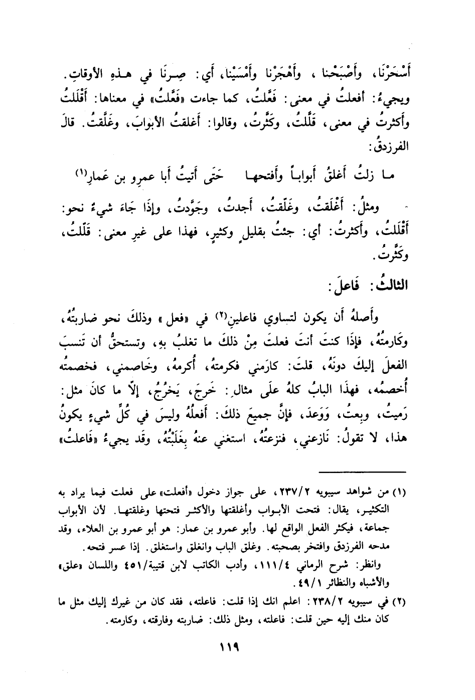 وأَصلهُ أَن يكون لتساوي فاعلينِ2 في "فعل" وذلكَ نحو ضاربتُهُ وكَارمتُهُ فإذَا كنتَ أنتَ فعلتَ مِنْ ذلكَ ما تغلبُ بهِ وتستحقُّ أن تَنسبَ الفعلَ إليكَ دونَهُ قلتَ: كارَمني فكرمتهُ أُكرمهُ وخَاصمني فخصمتُه أُخصمُه فهذَا البابُ كلهُ علَى مثالِ: خَرجَ يَخرُجُ إلا ما كانَ مثل: رَميتُ وبِعتُ وَوَعدَ فإنَّ جميعَ ذلكَ: أَفعلُهُ وليسَ في كُلِّ شيءٍ يكونُ هذا لا تقولُ: نَازعني فنزعتُهُ استغني عنهُ بِغَلَبْتُهُ وقَد يجيءُ "فَاعلتُ".