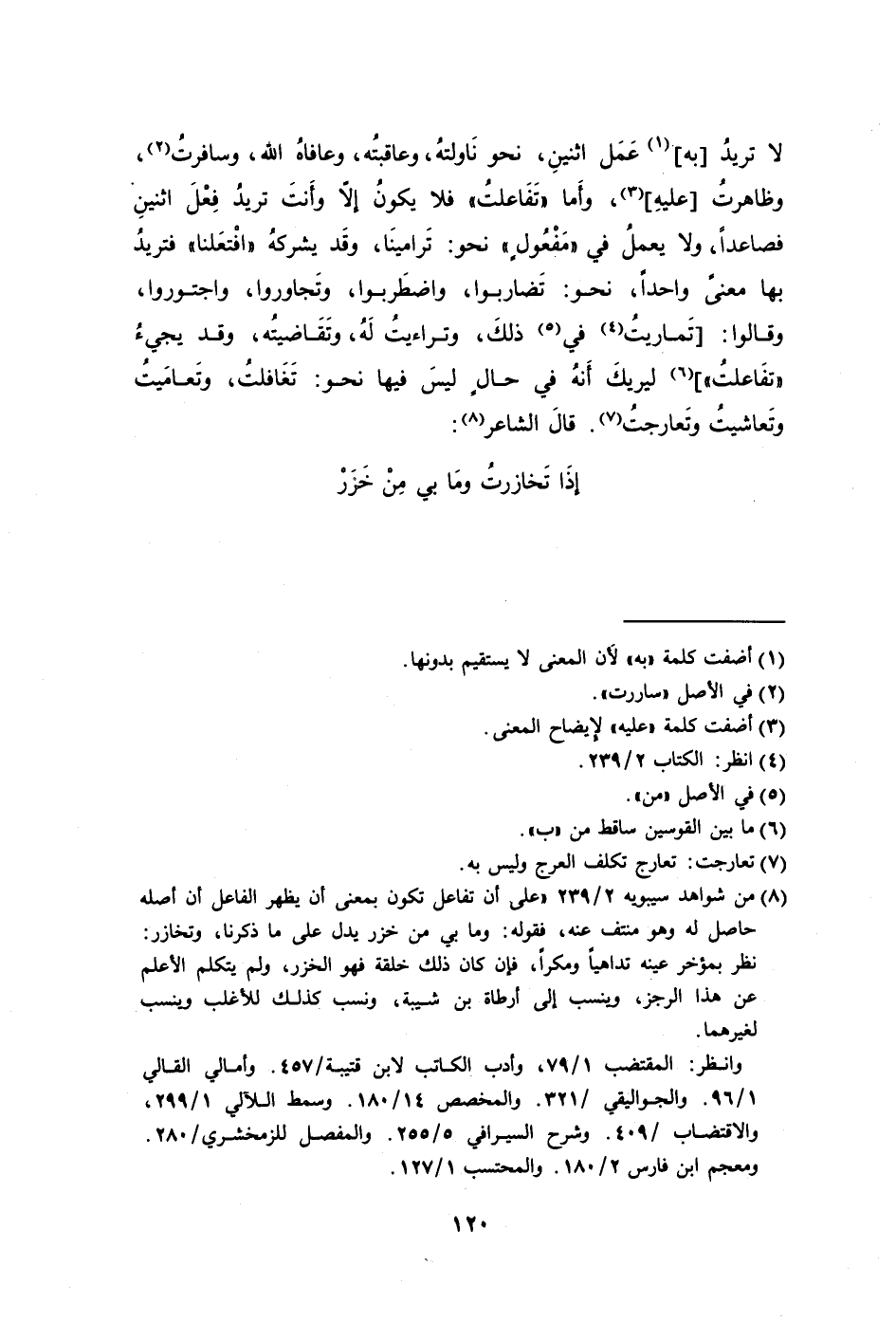 لا تريدُ [به] 1 عَمَل اثنينِ نحو نَاولتهُ وعاقبتُه وعافاه الله وسافرتُ2 وظاهرتُ [عليهِ] 3 وأَما "تَفَاعلتُ" فلا يكونُ إلا وأَنتَ تريدُ فِعْلَ اثنينِ فصاعدًا ولا يعملُ في "مَفْعولٍ" نحو: تَرامينَا وقَد يشركهُ "افْتعَلنا" فتريدُ بها معنىً واحدًا نحو: تَضاربوا واضطَربوا وتَجاوروا واجتوروا وقالوا: [تَماريتُ] 4 في5 ذلكَ وتراءيتُ لَهُ وتَقَاضيتُه وقد يجيءُ "تفَاعلتُ"] 6 ليريكَ أَنهُ في حالٍ ليسَ فيها نحو: تَغَافلتُ وتَعامَيتُ وتَعاشيتُ وتعارجتُ7. قالَ الشاعر8: