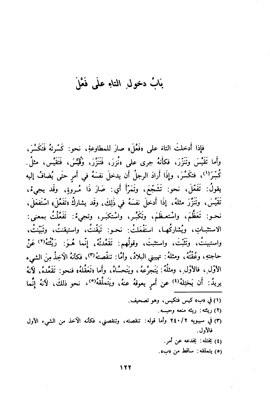 فإِذا أدخلتَ التاءَ على "فَعَّلَ" صارَ للمطاوعةِ نحو: كَسّرتهُ فَتَكَسَّرَ وأَما تَقَيَّسَ وتَنَزّرَ فكأَنهُ جرى على "نُزرَ فَتَنَزَّرَ وَقُيِّسَ فَتَقَيَّس مثلُ. كُسِّرَ1 فتكَسَّرَ وإِذَا أَرادَ الرجلُ أَن يدخلَ نفسَهُ في أَمرٍ حتَى يُضافُ إليه يقولُ: تَفَعّلَ نحن: تَشَجّع وتَمَرّأَ أَي: صَارَ ذَا مُروةٍ وقَد يجيءُ تَقَيَّسَ وتَنَزَّرَ مثلُه إذَا أَدخلَ نفسَهُ في ذَلِكَ وقَد يشاركُ "تَفَعَّلَ" اسْتَفعَلَ نحو: تَعَظَّمَ واسْتعظَمَ وتَكَبَّر واسْتكبَر وتجيءُ: تَفَعّلْتُ بمعنى: الاستثباتِ ويُشاركُها استَفْعَلتُ: نحو: تَيَقّنتُ واستيقنتُ وتَبَيّنتُ واستبينتُ وتَثَبّتَ واستثبتَ وقولُهم: تَقَعَّدتْهُ إِنّما هُوَ: رَيَّثْتهُ2 عَنْ حاجتهِ وعُقْتُهُ ومثلهُ: تهيبني البلادُ وأمَّا: تنقّصتهُ3 فكأنهُ الآخِذُ مِنَ الشيء الأوّلَ فالأوّلِ ومثلُهُ: يَتَجرَّعهُ ويَتَحسَّاهُ وأَما "تَعَقَّلهُ" فنحو: تَقَعَّدهُ لأَنهُ يريدُ: أَن يَختِلهُ4 عن أَمرٍ يعوقهُ عنهُ ويَتَملَّقه5 نحو ذلكَ لأَنهُ إِنَّما