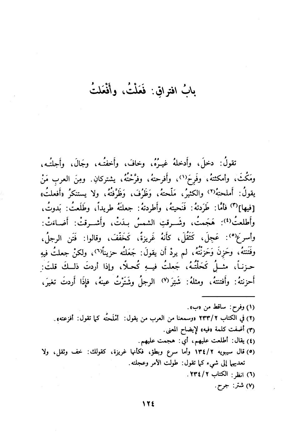 تقول: دخلَ وأَدخلهُ غيرُهُ وخافَ وأَخفتُه وجَالَ وأَجلتُه ومَكُثَ وأمكثتهُ وفَرِحَ1، وأَفرحتهُ وفرَّحْتُهُ يشتركانِ. ومِنَ العربِ مَنْ يقولُ: أَملحتهُ2 والكثيرُ مَلّحتهُ وَظَرُفَ وَظَرَّفتُهُ ولا يستنكرُ "أَفعلتُ" [فيها] 3 فأمَّا: طَرَدتهُ: فَنَحيتهُ وأَطردتهُ: جعلتَهُ طريدًا وأطَلَعتُ4: بَدوتُ وأَطلعتُ: هَجمتُ وشَرقتِ الشمسُ بدَتْ وأَشرقتْ: أَضاءَتْ: وأسرعَ5: عَجِلَ كَثَقُلَ كأَنهُ غَريزةٌ كَخَفّفَ وقالوا: فَتَن الرجلُ وفَتَنتهُ وحَزِنَ وَحَزنْتُهُ لم يردْ أَن يقولَ: جَعَلتُه حزيناً6 ولكنْ جعلتُ فيهِ حزنًا مثلُ كَحَلْتُهُ جَعلتُ فيهِ كُحلًا وإذا أردتَ ذلكَ قلتَ: أَحزنتهُ: وأَفتنتهُ ومثلهُ: شَتِرَ7 الرجلُ وشَتَرْتُ عينهُ فإِذَا أَردتَ تغيرَ،