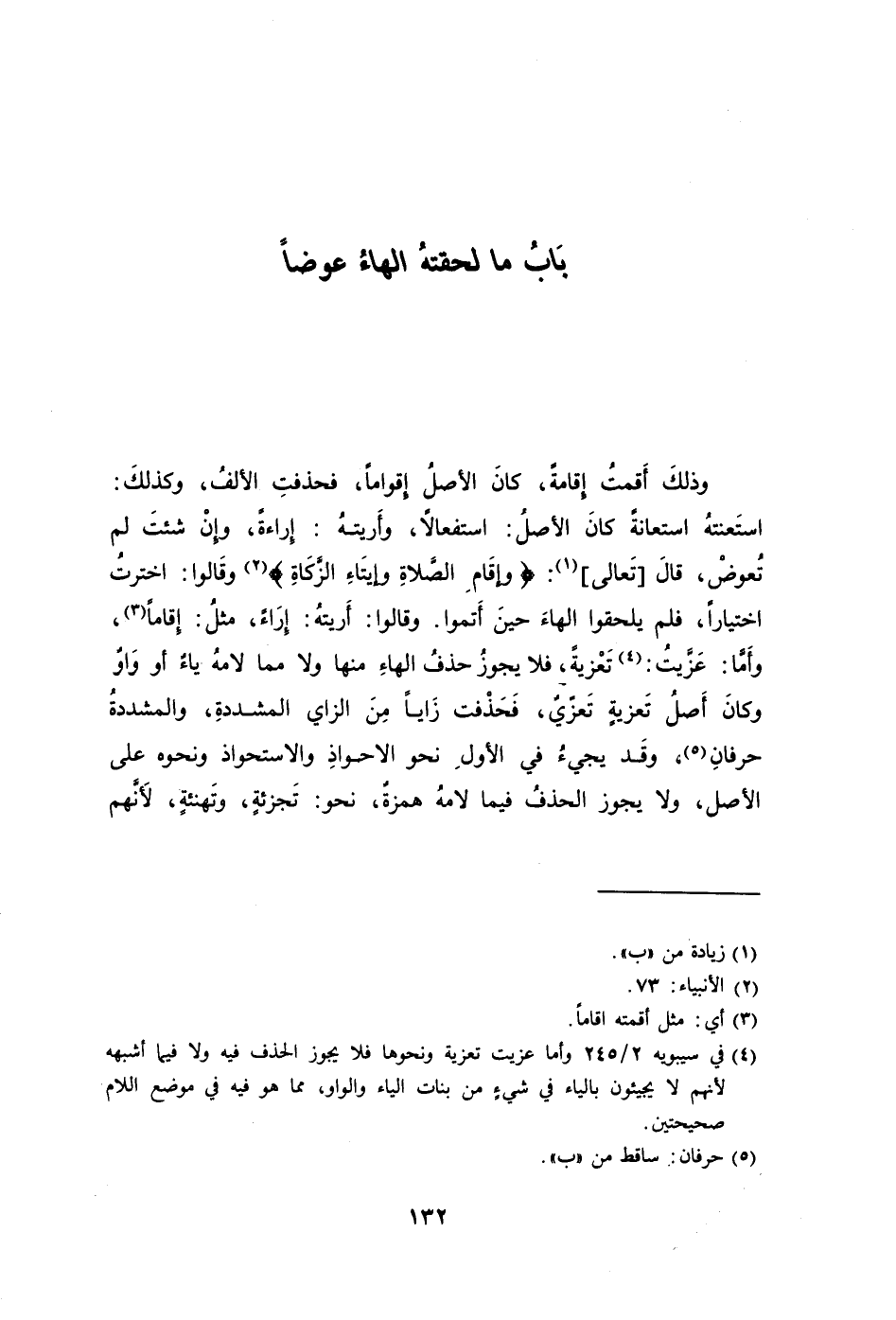 وذلكَ أَقمتُ إِقامةً كانَ الأصلُ إِقوامًا فحذفتِ الألفُ وكذلكَ: استَعنتهُ استعانةً كانَ الأصلُ: استفعالًا وأَريتهُ: إِراءةً وإِنْ شئتَ لم تُعوضْ قالَ تَعالى1: {وَإِقَامَ الصَّلاةِ وَإِيتَاءَ الزَّكَاةِ} 2 وقَالوا: اخترتُ اختيارًا فلم يلحقوا الهاءَ حينَ أَتموا. وقالوا: أَريتهُ: إِرَاءً مثلُ: إِقاماً3 وأَمَّا: عَزَّيتُ4: تَعْزيةً فلا يجوزُ حذفُ الهاءِ منها ولا مما لامهُ ياءٌ أو وَاوٌ وكانَ أَصلُ تَعزيةٍ تَعزّيٌ فَحَذْفت زَايًا مَنَ الزاي المشددةِ والمشددةُ حرفانِ5 وقَد يجيءُ في الأولِ نحو الاحواذِ والاستحواذ ونحوه على الأصل ولا يجوز الحذفُ فيما لامهُ همزةٌ نحو: تَجزئةٍ وتَهنئةٍ لأَنَّهم