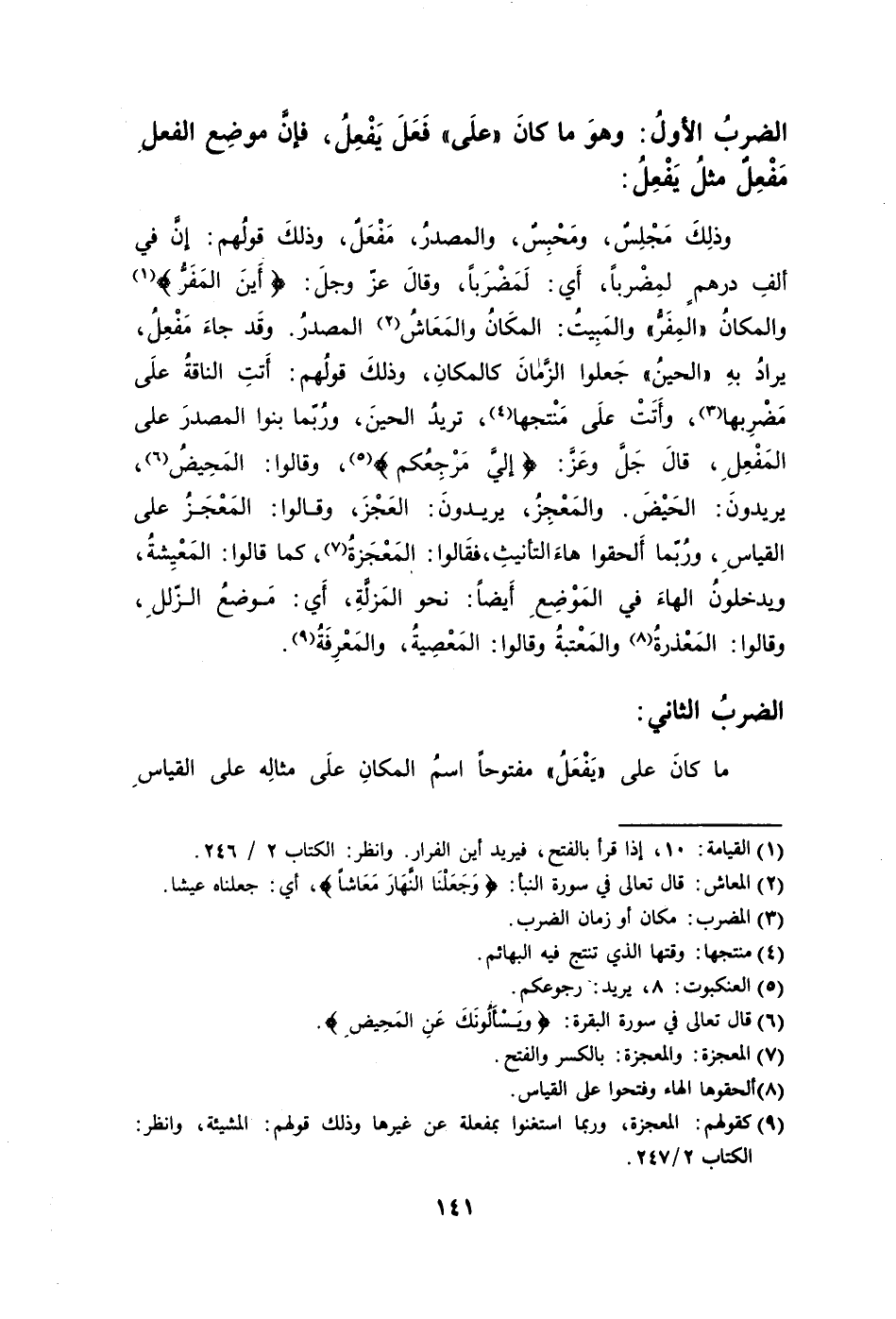وذلِكَ مَجْلِسٌ ومَحْبِسٌ والمصدرُ مَفْعَلٌ وذلكَ قولُهم: إنَّ في ألفِ درهمٍ لمِضْربًا أَي: لَمَضْرَبًا وقالَ عزّ وجلَ: {أَينَ المَفَرُّ} 1 والمكانُ "المِفَرُّ" والمَبِيتُ: المكَانُ والمَعَاشُ2 المصدرُ. وقَد جاءَ مَفْعِلُ يرادُ بهِ "الحينُ" جَعلوا الزَّمانَ كالمكانِ وذلكَ قولُهم: أَتتِ الناقةُ علَى مَضْرِبها3 وأَتَتْ علَى مَنْتجها4 تريدُ الحينَ ورُبّما بنوا المصدرَ على المَفْعِلِ قالَ جَلَّ وعَزَّ: {إليَّ مرْجِعُكُمْ} 5 وقالوا: المَحِيضُ6 يريدونَ: الحَيْضَ. والمَعْجِزُ يريدونَ: العَجْزَ وقالوا: المَعْجِزُ القياسِ ورُبّما أَلحقوا هاءَ التأنيثِ فقَالوا: المَعْجَزةُ7 كما قالوا: المَعْيِشةُ ويدخلونُ الهاءَ في المَوْضِعِ أيضًا: نحو المَزلَّةِ أَي: مَوضعُ الزّللِ وقالوا: المَعْذرةُ8 والمَعْتبةُ وقالوا: المَعْصِيةُ والمَعْرِفَةُ9.