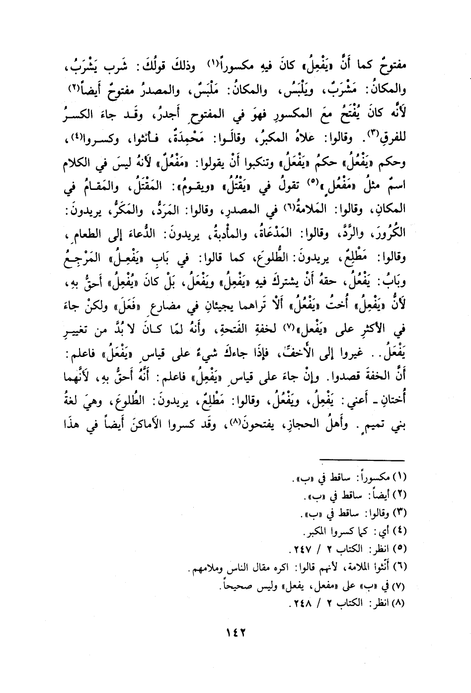 مفتوحٌ كما أَنَّ "يَفْعِلُ" كانَ فيهِ مكسوراً1 وذلكَ قولُكَ: شَرب يَشْرَبُ والمكانُ: مَشْرَبٌ ويَلْبَسُ والمكانُ: مَلْبَسٌ والمصدرُ مفتوحٌ أيضًا2 لأَنَّه كانَ يُفتَحُ معَ المكسورِ فهوَ في المفتوحِ أَجدرُ وقَد جاءَ الكسرُ للفرقِ3. وقالوا: علاهُ المكبرُ وقالَوا: مَحْمِدَةٌ فأنثوا وكسروا4، وحكم "يفْعُلُ" حكمُ "يَفْعَلُ" وتنكبوا أَنْ يقولوا: "مَفْعُلٌ" لأَنهُ ليسَ في الكلام اسمٌ مثلُ "مَفْعُلٍ5" تقولُ في "يَقْتُلُ" "ويقومُ": المَقْتَلُ والمَقامُ في المكانِ وقالوا: المَلامةُ6 في المصدرِ وقالوا: المَرَدُّ والمَكَرُّ يريدونَ: الكُرُورَ والرَّدَّ وقالوا: المَدْعَاةُ والمأْدبةُ يريدونَ: الدَّعاءَ إلى الطعامِ وقالوا: مطْلِعٌ يريدونَ الطُّلوعَ كما قالوا: في بَابِ "يَفْعِلُ" المَرْجِعُ وبَابُ: يَفْعُلُ حقهُ أَنْ يشتركَ فيهِ "يَفْعَلُ" ويَفْعَلُ بَلْ كانَ "يُفْعِلُ" أَحقُّ بهِ لأَنُّ "يَفْعِلُ"7 أُختُ "يَفْعُلُ" أَلاْ تَراهما يجيئانِ في مضارعِ "فَعَلَ" ولكنْ جاءَ في الأكثرِ على "يَفْعل" لخفةِ الفَتحةِ وأَنهُ لمّا كانَ لا بُدَّ من تغييرِ يَفْعَلُ غيروا إلى الأَخفِّ فإذَا جاءكَ شيءٌ على قياسِ "يَفْعَلُ" فاعلم: أَنَّ الخفةَ قصدوا وإنْ جاءَ على قياسِ "يَفْعِلُ" فاعلم: أَنَّهُ أَحقُّ بهِ لأَنَّهما أُختانِ أَعني: يَفْعِلُ ويَفْعُلُ وقالوا: مَطْلِعٌ يريدونَ: الطُلوعَ وهيَ لغةُ بني تميمِ. وأَهلُ الحجازِ يفتحونَ8، وقَد كسروا الأَماكنَ أيضًا في هذَا