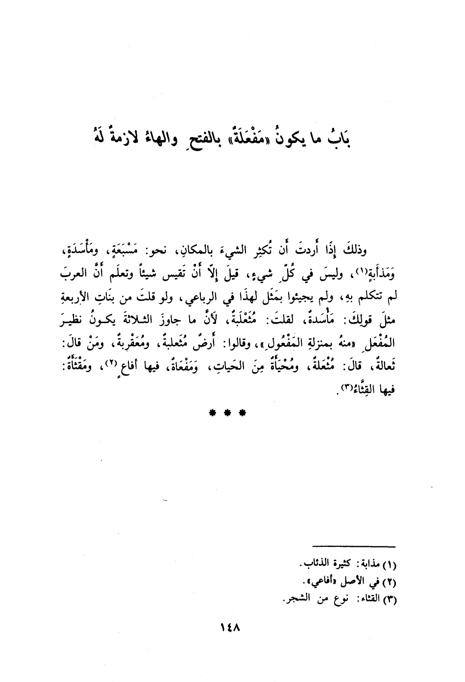 وذلكَ إِذَا أَردتَ أَن تُكثِر الشيءَ بالمكانِ نحو: مَسْبَعَةٍ ومَأْسَدَةٍ وَمَذأَبةٍ1، وليسَ في كُلِّ شيءٍ قيلَ إلا أَنْ تَقيس شيئًا وتعلَم أَنَّ العربَ لم تتكلم بهِ ولم يجيئوا بمَثَل لهذَا في الرباعي ولو قلتَ من بنَاتِ الأربعةِ مثلَ قولِكَ: مَأْسَدةٌ لقلتَ: مُثَعْلَبةٌ لأَنَّ ما جاوزَ الثلاثةَ يكونُ نظيرَ المُفْعَلِ "منهُ بمنزلةِ المَفْعُولِ" وقالوا: أَرضٌ مُثَعلبةٌ ومُعَقْربةٌ ومَنْ قالَ: ثَعالةٌ قالَ: مُثْعَلةٌ ومُحْيَأَةٌ مِنَ الحَياتِ وَمَفْعَاةٌ فيها أَفاعٍ2 ومَقْثَأَةٌ: فيها القِثَّاءُ3.