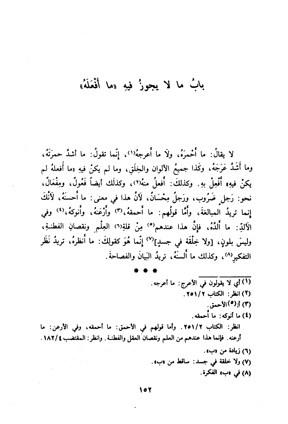لا يقالُ: ما أَحْمرَهُ ولاَ ما أَعرجهُ1 إِنّما تقولُ: ما أشدَّ حمرَتَهُ وما أَشَدَّ عَرَجَهُ وكَذا جميعُ الألوان والخِلَقِ وما لم يكنْ فيهِ "ما أَفعلهُ لم يكنْ فيهِ" أَفْعِلْ بهِ. وكذلكَ: أَفعلُ منهَ2، وكذلَك أيضًا فَعُولٌ ومِفْعَالٌ نحو: رَجلٍ ضَرُوب ورَجلٌ مِحْسَانٌ لأَنَّ هذا في معنى: ما أَحسنَهُ لأَنَّكَ إِنما تريدُ المبالغةَ وأَمَّا قولُهم: ما أَحمقهُ3 وأَرْعَنهُ وأَنوكهُ،4 وفي الأَلدِّ: ما أَلدَّهُ فإِنَّ هذا عندهم5 مِنْ قلةِ6 العِلْمِ ونقصانِ الفطنةِ وليسَ بلونٍ [ولا خِلْقَة في جسدٍ] 7 إِنّما هُوَ كقولِكَ: ما أنظرَهُ تريدُ نَظَر التفكيرِ8 وكذلك ما أَلسنَهُ تريدُ البَيانَ والفصاحةَ.