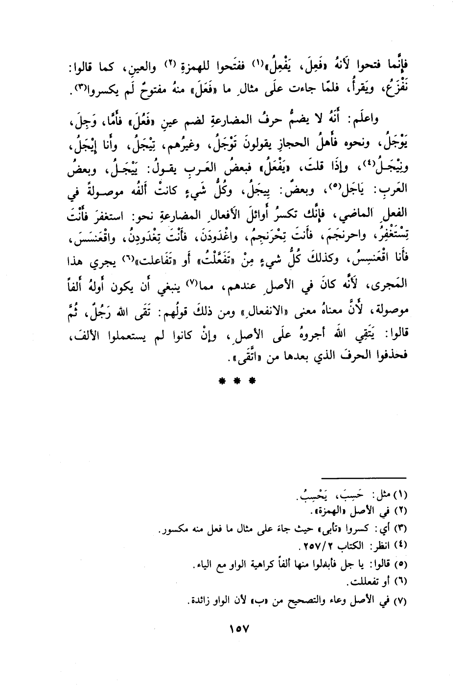 واعلَم: أَنَهُ لا يضمُّ حرفُ المضارعةِ لضم عينِ "فَعُلَ" فأَمَّا وَجِلَ يَوْجَلُ ونحوه فأَهلُ الحجازِ يقولونَ تَوْجَلُ وغيرُهم تِيْجَلُ وأَنا إِيْجَلُ ونِيْجَلُ4 وإذَا قلتَ "يَفْعَلُ" فبعضُ العَربِ يقولُ: يَبْجَلُ وبعضُ العَربِ: يَاجَل5 وبعضُ: يِيجَلُ وكُلُّ شَيءٍ كانتْ أَلفُه موصولةً في الفعلِ الماضي فإِنَّك تكسرُ أَوائلَ الأَفعالِ المضارعةِ نحو: استعفرَ فأَنْتَ تِسْتَغْفِرُ واحرنَجَمَ فأَنتَ تِحْرَنجِمُ واغْدَودَنَ فأَنْتَ تِغْدَودِنُ واقْعَنسَسَ فأنا اقْعَنسِسُ وكذلكَ كُلُّ شيءٍ مِنْ "تَفَعَّلْتُ" أَو"تَفَاعلت"6 يجري هذا المَجرى لأَنَّه كانَ في الأصلِ عندهم مما7 ينبغي أَن يكون أَولهُ أَلفًا موصولة لأَنَّ معناهُ معنى "الانفعالِ" ومن ذلكَ قولُهم: تَقَى الله رَجُلٌ ثُمَّ قالوا: يَتَقِي الله أجروهُ علَى الأصلِ وإنْ كانوا لم يستعملوا الألفَ فحذفوا الحرفَ الذي بعدها من "اتَّقَى".