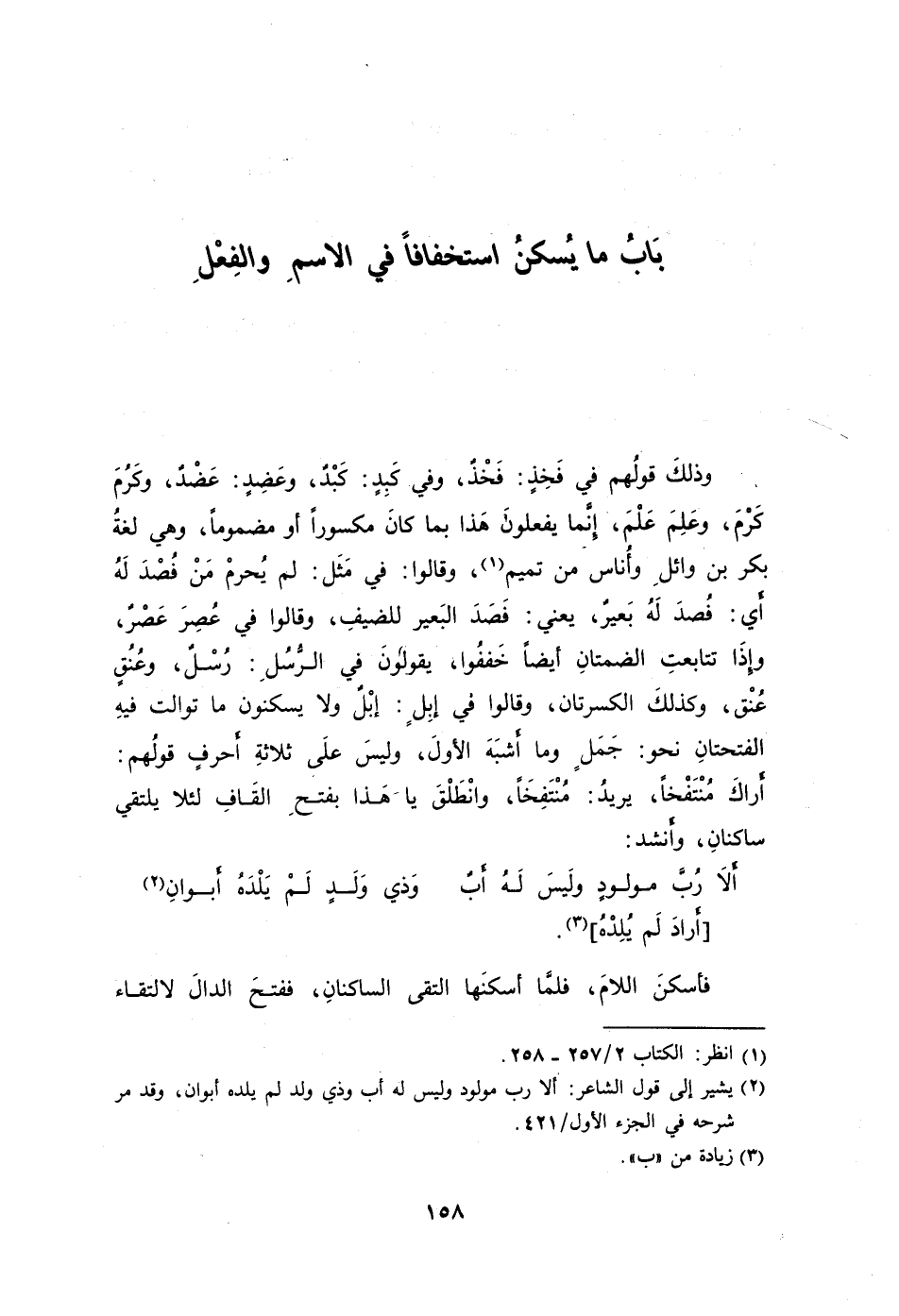 وذلكَ قولُهم في فَخِذٍ: فَخْذٌ وفي كَبِدٍ: كَبْدٌ وعَضِدٍ: عَضْدٌ وكَرُمَ كَرْمَ وعَلِمَ عَلْمَ إِنَّما يفعلونَ هَذا بما كانَ مكسورًا أو مضمومًا وهي لغةُ بكر بن وائلِ وأُناس من تميم1 وقالوا: في مَثَل: لم يُحرمْ مَنْ فُصْدَ لَهُ أَي: فُصدَ لَهُ بِعيرٌ يعني: فَصَدَ البَعير للضيفِ وقالوا في عُصِرَ عَصْرٌ وإِذَا تتابعتِ الضمتانِ أيضًا خَففُوا يقولونَ في الرُّسُلِ: رُسْلٌ وعُنُقٍ عُنْق وكذلكَ الكسرتان وقالوا في إبِلٍ: إبْلٌ ولا يسكنون ما توالت فيهِ الفتحتانِ نحو: جَمَلٍ وما أَشبَهُ الأولَ وليسَ علَى ثلاثةِ أَحرفٍ قولُهم: أَراكَ مُنْتَفْخًا يريدُ: مُنْتَفِخًَا وانْطَلْقَ يا هَذا بفتحِ القَافِ لئلا يلتقي ساكنانِ وأَنشد: