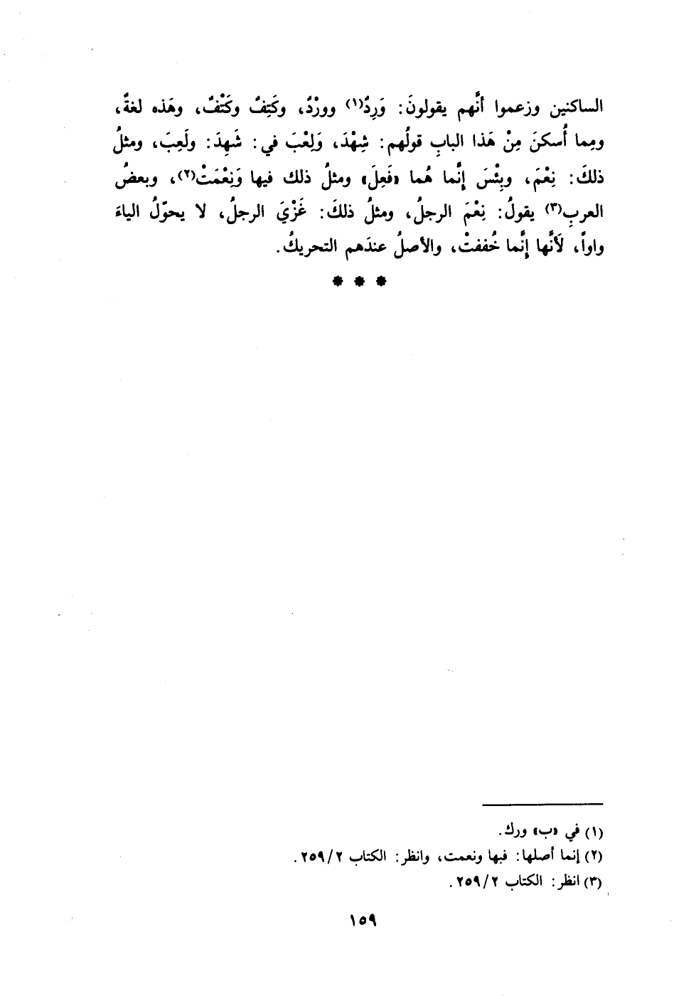 الساكنين وزعموا أنَّهم يقولونَ: وَرِدٌ1 وورْدٌ وكَتِفٌ وكَتْفٌ وهَذه لغةٌ ومِما أُسكنَ مِنْ هَذا البابِ قولُهم: شِهْدَ وَلِعْبَ في: شَهِدَ: ولَعِبَ ومثلُ ذلكَ: نِعْمَ وبِئْسَ إِنَّما هُما "فَعِلَ" ومثلُ ذلك فيها وَنِعْمَتْ2 وبعضُ العربِ يقولُ: نِعْمَ الرجلُ ومثلُ ذلكَ: غَزْيَ الرجلُ لا يحوّلُ الياءَ واوًا لأَنَّها إِنَّما خُففتْ والأصلُ عندَهم التحريكُ.