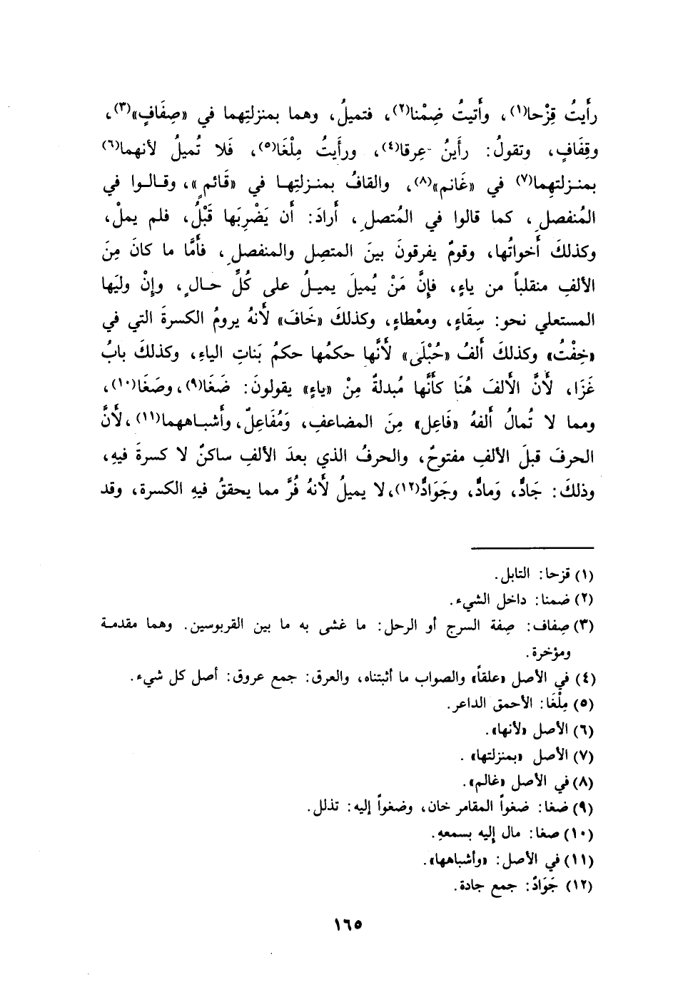 رأَيتُ قِزْحا1 وأَتيتُ ضِمْنا2 فتميلُ وهما بمنزلتِهما في "صِفَافٍ"3، وقِفَافٍ وتقولُ: رأَينُ عِرقا4، ورأَيتُ مِلْغَا5، فَلا تُميلُ لأنهما6 بمنزلتهِما7 في "غَانم"8 والقافُ بمنزلتِها في "قَائمٍ" وقالوا في المُنفصلِ كما قالوا في المُتصلِ أَرادَ: أَن يَضْرِبَها قَبْلُ فلم يملْ وكذلكَ أَخواتُها وقومٌ يفرقونَ بينَ المتصِل والمنفصلِ فأَمَّا ما كانَ مِنَ الألفِ منقلبًا من ياءٍ فإِنَّ مَنْ يُميلَ يميلُ على كُلِّ حالٍ وإِنْ وليَها المستعلي نحو: سِقَاءٍ ومعْطاءٍ وكذلكَ "خَافَ" لأَنهُ يرومُ الكسرةَ التي في "خِفْتُ" وكذلكَ أَلفُ "حُبْلَى" لأَنَّها حكمُها حكمُ بَناتِ الياءِ وكذلكَ بابُ غَزَا لأَنَّ الأَلفَ هُنَا كأَنَّها مُبدلةٌ مِنْ "ياءٍ" يقولونَ: ضَغَا9 وصَغَا10 ومما لا تُمالُ أَلفهُ "فَاعِل" مِنَ المضاعفِ وَمُفَاعِلٌ وأَشبهاههما11، لأَنَّ الحرفَ قبلَ الألفِ مفتوحٌ والحرفُ الذي بعدَ الألفِ ساكنٌ لا كسرةَ فيهِ وذلكَ: جَادٌّ وَمادٌّ وجَوَادٌّ12، لا يميلُ لأَنهُ فُرَّ مما يحققُ فيهِ الكسرة وقد