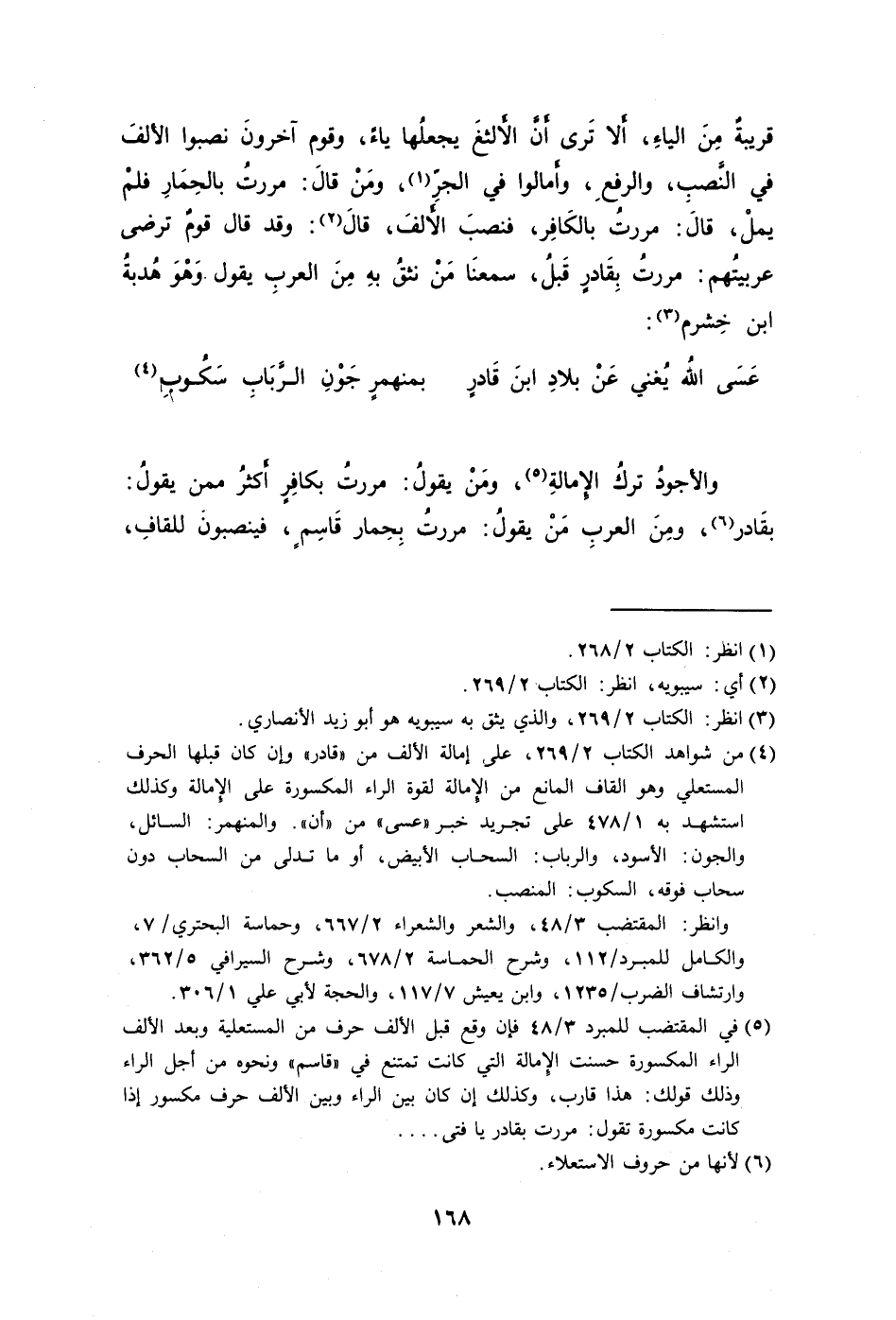 قريبةٌ مِنَ الياءِ أَلا تَرى أَنَّ الأَلثغُ يجعلُها ياءً وقوم آخرونَ نصبوا الألفَ في النَّصبِ والرفعِ وأَمالوا في الجرِّ1 ومَنْ قالَ: مررتُ بالحِمَارِ فلمْ يملْ قالَ: مررتُ بالكَافِر فنصبَ الألَفَ قالَ2: وقد قال قومٌ ترضى عربيتُهم: مررتُ بِقَادرٍ قَبلُ سمعنَا مَنْ نثقُ بهِ مِنَ العربِ يقول وَهْوَ هُدبةُ ابن خِشرم3: