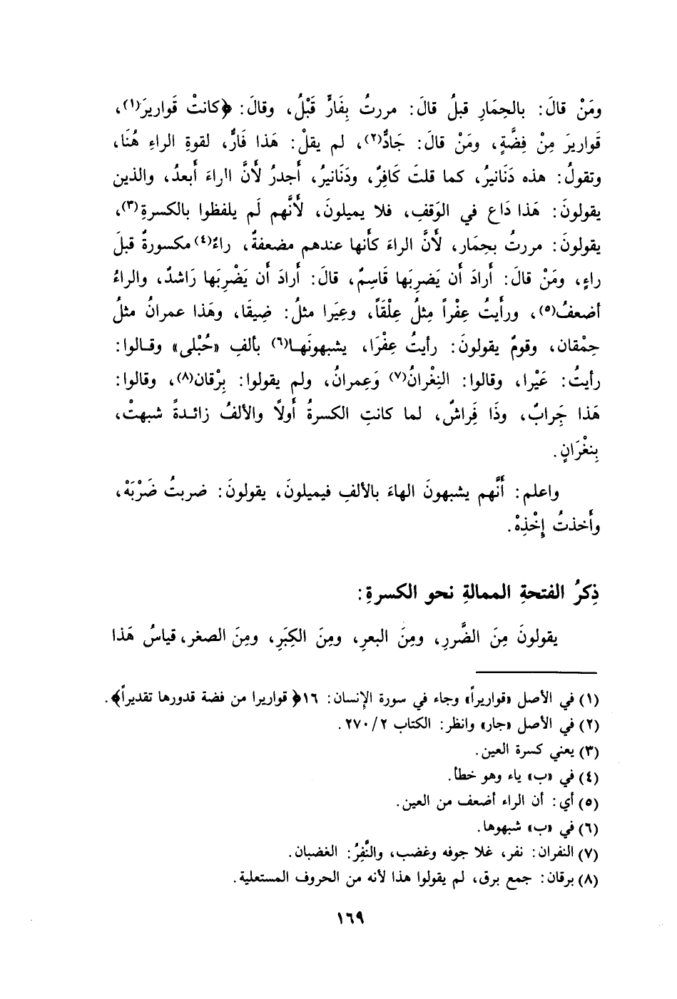 ومَنْ قالَ: بالحِمَارِ قبلُ قالَ: مررتُ بِفَارٍّ قَبْلُ وقالَ: {كَانَتْ قَوَارِيرَا 1 قَوَارِيرَا مِنْ فِضَّةٍ} ومَنْ قالَ: جَادٌّ2 لم يقلْ: هَذا فَارٌّ لقوةِ الراءِ هُنَا وتقولُ: هذه دَنَانيرُ كما قلتَ كَافِرٌ ودَنَانيرُ أَجدرُ لأَنَّ الراءَ أَبعدُ والذين يقولونَ: هَذا دَاع في الوَقفِ فلا يميلونَ لأَنَّهم لَم يلفظوا بالكسرةِ3، يقولونَ مررتُ بحِمَار لأَنَّ الراءَ كأَنها عندهم مضعفةٌ راءٌ4 مكسورةٌ قبلَ راءٍ ومَنْ قالَ: أَرادَ أَن يضَرِبَها قَاسِمٌ قالَ: أَرادَ أَن يَضْرِبَها رَاشدٌ والراءُ أَضعفُ5، ورأَيتُ عِفْرًا مِثلُ عِلْقًَا وعِيَرا مثلُ: ضِيقَا وهَذا عمرانُ مثلُ حِمْقان وقومٌ يقولونَ: رأيتُ عِفْرَا يشبهونَها6 بألفِ "حُبْلى" وقالوا: رأيتُ: عَيْرا وقالوا: النِغْرانُ7 وَعِمرانُ ولم يقولوا: بِرْقان8، وقالوا: هَذا جَرابٌ وذَا فَراشٌ لما كانتِ الكسرةُ أَولًا والألفُ زائدةً شبهتْ بِنغْرَانٍ.