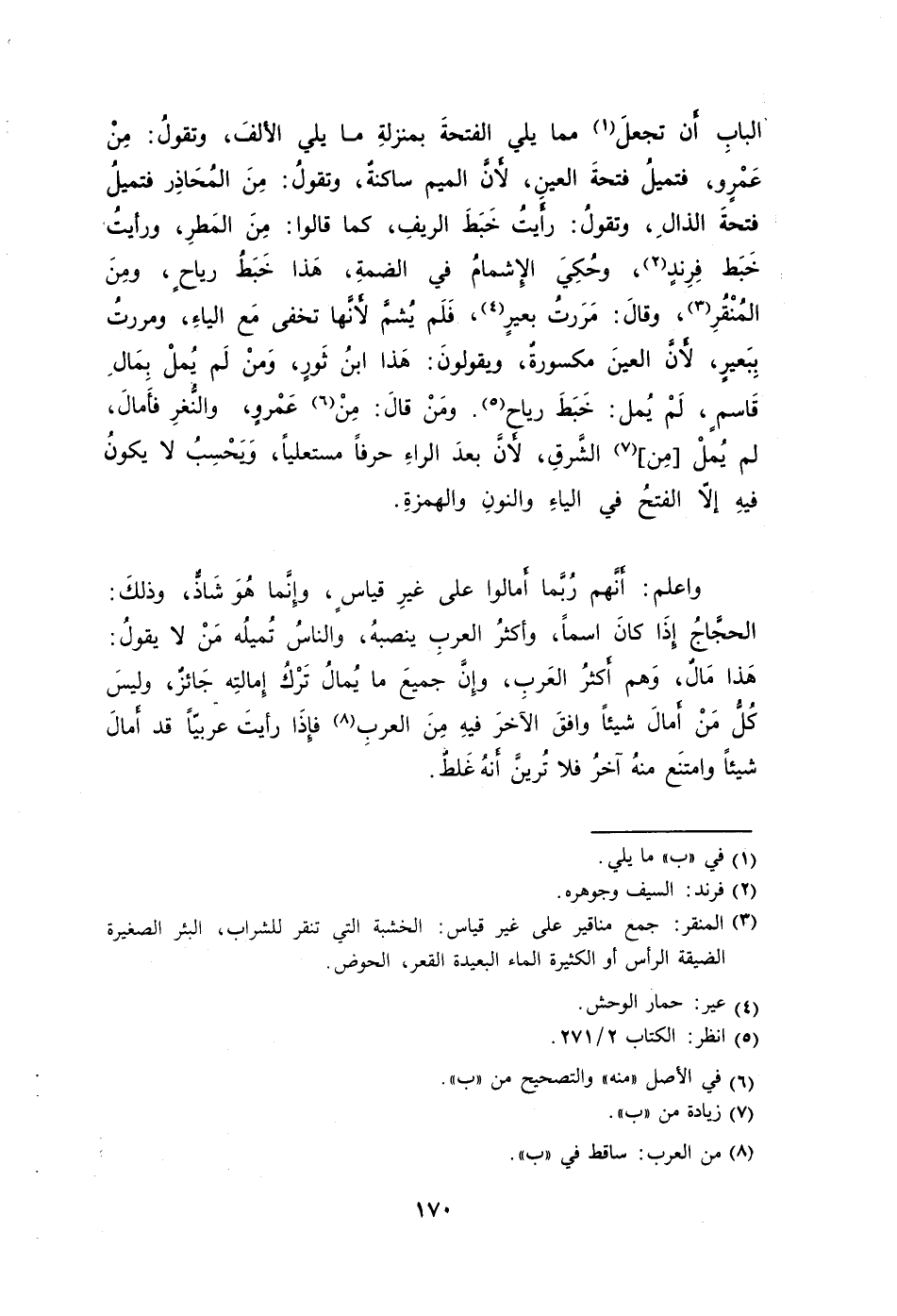 واعلم: أَنَّهم رُبَّما أَمالوا على غيرِ قياسٍ وإِنَّما هُوَ شَاذٌّ وذلكَ: الحجَّاجُ إِذَا كانَ اسمًا وأكثرُ العربِ ينصبهُ والناسُ تُميلُه مَنْ لا يقولُ: هَذا مَالٌ وَهم أَكثرُ العَربِ وإِنَّ جميعَ ما يُمالُ تَرْكُ إِمالتِه جَائزٌ وليسَ كُلٌّ مِنْ أَمالَ شيئًا وافقَ الآخرَ فيهِ مِنَ العربِ8 فإِذَا رأيتَ عربيًّا قد أَمالَ شيئًا وامتنَع منهُ آخرُ فلا تُرينَّ أَنهُ غَلطٌ.