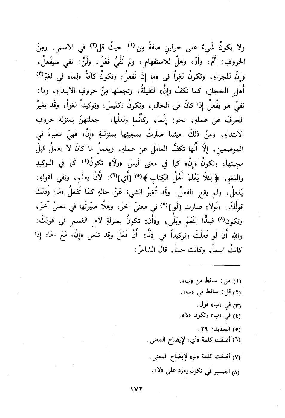 ولا يكونُ شَيءٌ على حرفينِ صفةً مِن1 حيثُ قل2 في الاسمِ. ومِنَ الحروفِ: أَمْ وأَوْ وهَلْ للاستفهامِ ولم نَفْيُ فَعَلَ ولَنْ: نفي سيفَعلُ وإِنْ للجزاءِ وتكونُ لغوًا في "ما إِنْ تَفعلُ" وتكونُ كافةً "لِمَا" في لغةِ3 أَهلِ الحجازِ كما تكفُ "إِنَّ" الثقيلةُ وتجعلها مِنْ حروفِ الابتداء ومَا: نفيُ هو يَفْعلُ إِذا كانَ في الحالِ وتكونُ "كليسَ" وتوكيدًا لغوًا وقَد يغيرُ الحرفَ عن عملهِ نحو: إِنّما وكأَنَّما ولعلَّما جعلتهنّ بمنزلةِ حروفِ الابتداء ومِنْ ذلكَ حيثما صارتْ بمجيئِها بمنزلةِ "إِنْ" فهيَ مغيرةٌ في الموضعينِ إلا أَنَّها تكفُّ العاملَ عن عملهِ ويعملُ ما كانَ لا يعملُ قبلَ مجِيئها وتكونُ "إِنْ" كما في معنى لَيسَ "ولاَ" تكونُ4 كَما في التوكيدِ واللغو {لِئَلاّ يَعْلَمَ أَهْلُ الكِتابِ} 5 [أَي] 6: لأَنْ يعلَم ونفي لقولهِ: يَفعلُ ولم يقعِ الفعلُ. وقَد تُغيرُ الشيءَ عَنْ حالهِ كمَا تَفعلُ "مَا" وذلكَ قولُكَ: "لَولا" صارت [لَو] 7 في معنىً آخرَ، وهَلاّ صيّرتَها في معنىً آخرَ وتكون8 ضِدًّا لِنَعَمْ وبَلَى و"أَن" تكونُ بمنزلةِ لامِ القسمِ في قولِكَ: واللِه أَنْ لو فَعَلْتَ وتوكيدًا في "لَمَّا" أَنْ فَعَلَ وقد تلغى "إِنْ" مَعَ "مَا" إِذا كانتْ اسمًا وكانَت حينًا قالَ الشاعرُ: