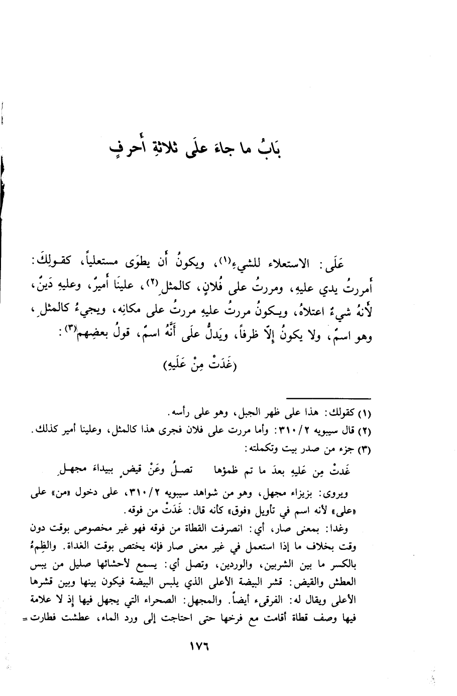 عَلَى: الاستعلاء للشيءِ1 ويكونُ أَن يطوَى مستعليًا كقولِكَ: أَمررتُ يدي عليهِ ومررتُ على فُلانٍ كالمثلِ2، علينَا أَميرٌ وعليهِ دَينٌ لأَنهُ شيءٌ اعتلاهُ ويكونُ مررتُ عليهِ مررتُ على مكانِه ويجيءُ كالمثلِ وهو اسمٌ ولا يكونُ إلا ظرفًا ويَدلُّ علَى أَنَّهُ اسمٌ قولُ بعضِهم3: