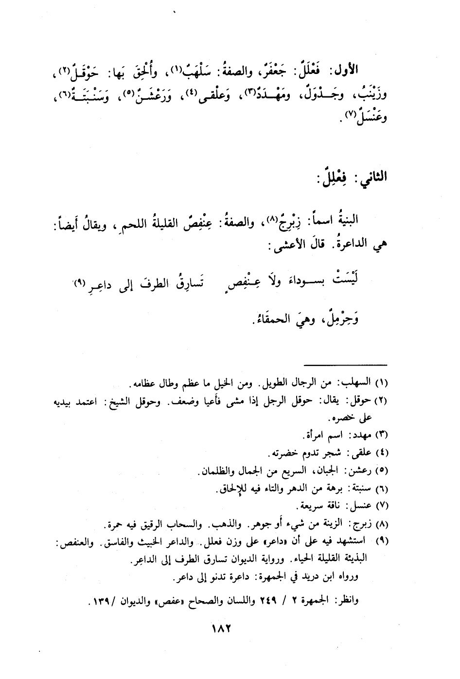 الأول: فَعْلَلٌ: جَعْفَرٌ والصفةُ: سَلْهَبٌ1 وأُلْحِقَ بَها: حَوْقَلٌ2، وزَيْنَبُ وجَدْوَلٌ ومَهْدَدٌ3 وَعلْقى4 وَرَعْشَنٌ5 وَسَنْبَتَةٌ6 وعَنْسَلٌ7.