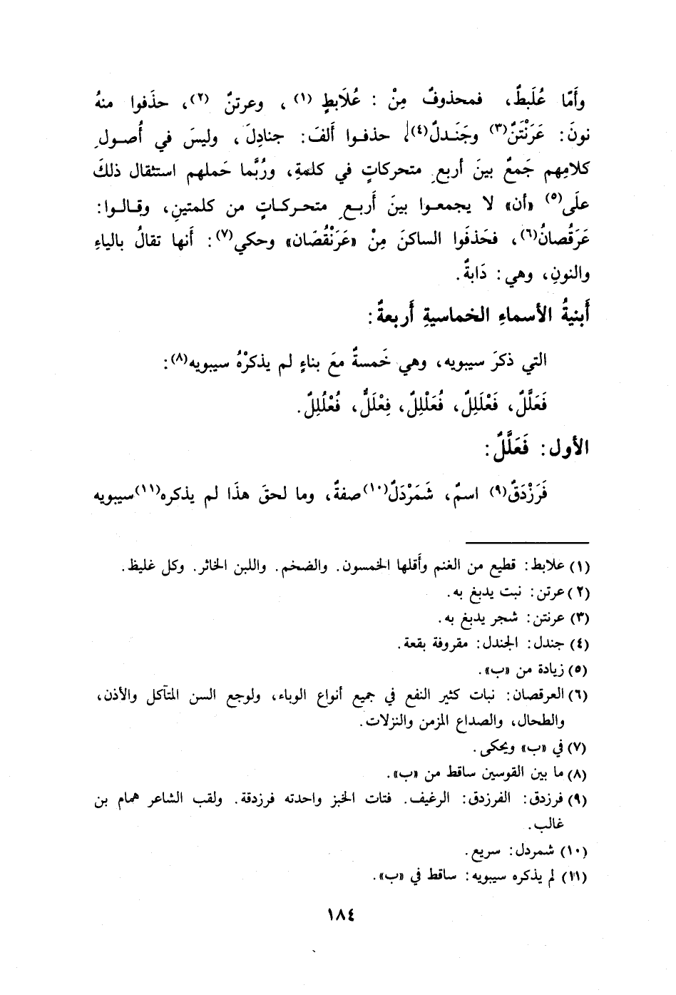 وأَمّا عُلَبطٌ فمحذوفٌ مِنْ: عُلاَبطٍ1 وعرتنٌ2 حذَفوا منهُ نونَ: عَرَنْتَنٌ3 وجَنَدلٌ4 حذفوا أَلفَ: جنادِلَ وليسَ في أُصولِ كلامِهم جَمعٌ بينَ أربعِ متحركاتِ في كلمةِ ورُبَّما حَملهم استثقال ذلكَ علَى5 "أن" لا يجمعوا بينَ أَربعِ متحركاتٍ من كلمتينِ وقالوا: عَرَقُصانُ6 فحَذفَوا الساكنَ مِنْ "عَرَنْقُصَان" وحكي7: أَنها تقالُ بالياءِ والنونِ وهي: دَابةٌ.