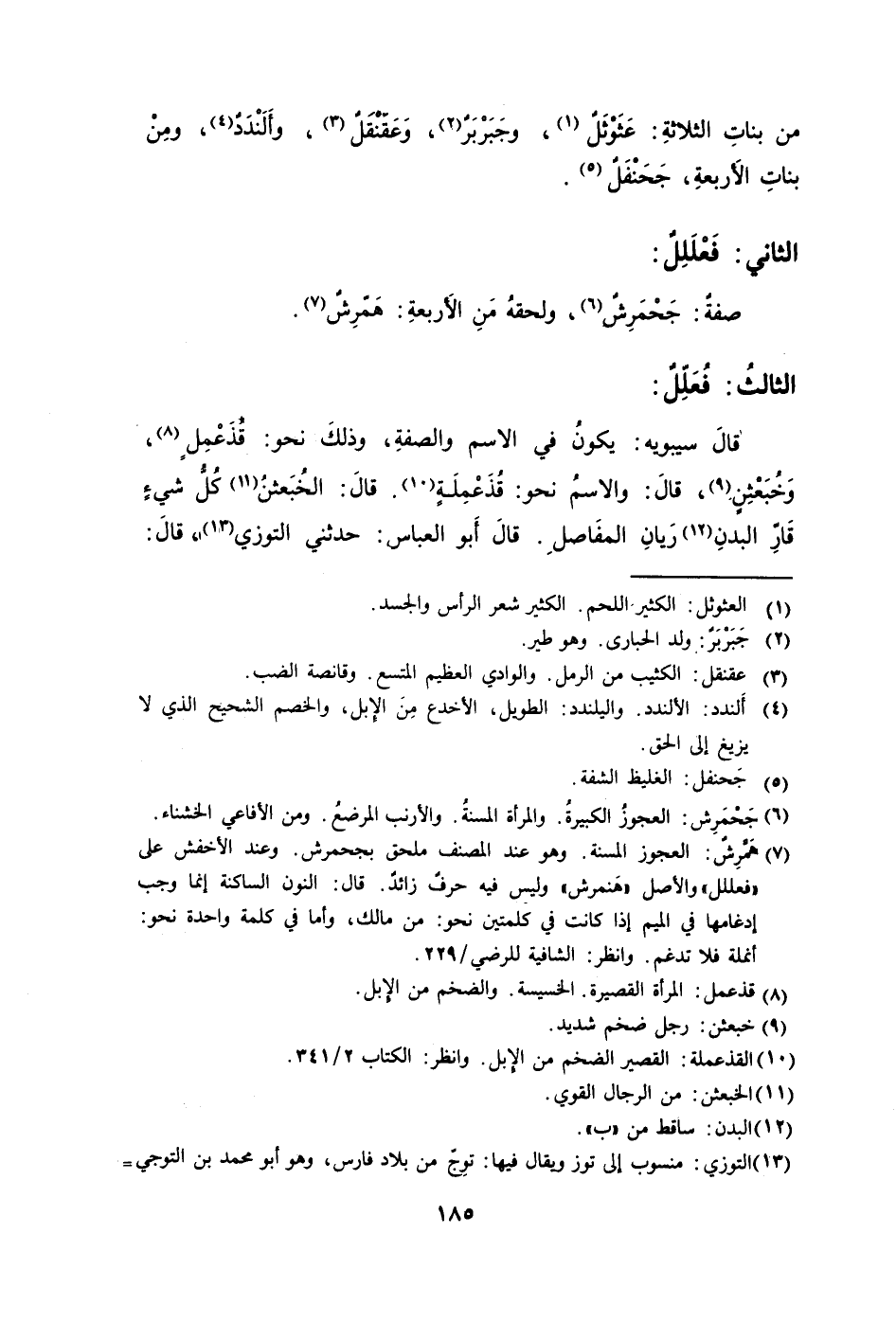 قالَ سيبويه: يكونُ في الاسم والصفةِ نحو: قُذَعْمِلٍ8، وَخُبَعْثِنٍ9 قالَ: والاسم نحو: قُذَعْمِلَةٍ10. قالَ: الخُبَعثنُ11 كُلُّ شيءٍ قَارِّ البدنِ12 رَيانِ المفَاصلِ. قالَ أَبو العباس: حدثني التوزي13 قالَ: