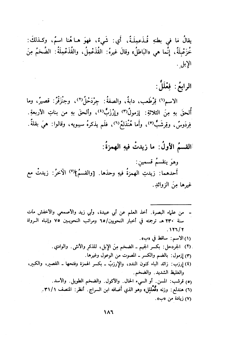 الاسم1 قَرْطَعب دابةٌ والصفةُ: جِرْدَحْلٌ2 وحِنْزَقْرٌ: قصيرٌ وما أُلحقِ بهِ مِنَ الثلاثةِ: إزمولٌ3 وإرْزَبٌّ4 وألحقَ بهِ من بناتِ الأربعةِ