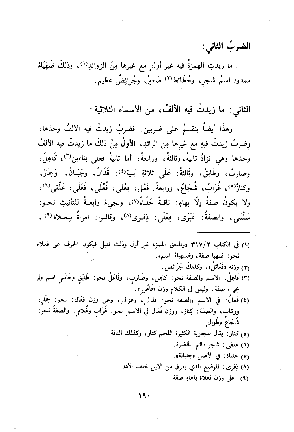 وهذَا أيضًا ينقسمُ على ضربين: فضربٌ زيدتْ فيه الألفُ وحدَها وضربٌ زيدتْ فيهِ معَ غيرِها مِنَ الزائدِ الأولُ مِنْ ذلكَ ما زيدتْ فيهِ الألفُ وحدها وهي تزادُ ثانيةً وثالثةً ورابعةً أما ثانيةً فعلى بناءين3 كَاهِلٌ وضاربٌ وطَابقٌ وثَالثةً: عَلَى ثلاثةِ أبنيةٍ4: قَذَالٌ وجَبَانٌ وَحِمَارٌ وكِنازٌ5 غُرَابٌ شُجَاعٌ ورابعةً: فَعْلى فِعْلَى فُعْلَى فَعَلَى عَلْقى6 ولا يكونُ صفةً إلا بهاءٍ: ناقةٌ حَلْباةٌ7 وتجيءُ رابعةً للتأنيثِ نحو: سَلْمَى والصفةُ: عَبْرَى فِعْلَى: ذِفرى8 وقالوا: امرأةٌ سِعلاة9،