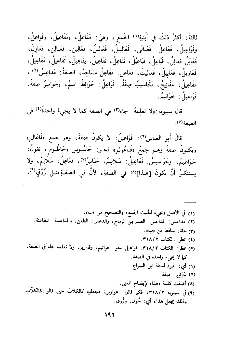 5 انظر: الكتاب 2/ 318. فواعيل نحو: خواتيم، وقوارير، ولا نعلمه جاء في الصفة، كما لا يجيء واحده في الصفة.
