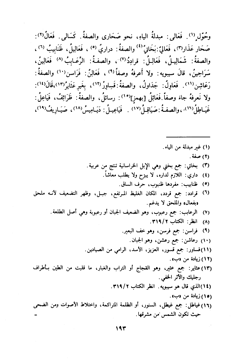 وحُوّلٍ1. فَعَالى: مبدلةُ الياءِ نحو صَحَارى والصفةُ. كَسَالى. فَعَالٌ2: صَحَار عَذَار3، فَعَاليٌ: بَخَاتيٌ4 والصفةُ: دراريٌ5 فَعَالِيلٌ ظَنَابِيبُ6، والصفةُ: شَمَالِيلُ فَعَالِلُ: قرادِدُ7 والصفةُ: الرَّعَابِبُ8 فَعَالينُ سَرَاحِينُ قالَ سيبويه: ولا أَعرفهُ وصفاً9 فَعَالِنٌ: فَرَاسن10 والصفةُ: رَعَاشِن11. فَعَاوِلٌ: جَدَاولُ والصفةُ: قَسِاوِرُ12 بِغَيرِ عَثَايرُ13 قَالَ14: ولا نَعرفهُ جاءَ وصفًا. فَعَائِلُ [بهمزٍ] 15: رسائلُ والصفةُ: ظَرَائِفُ فَيَاعِلُ: غَيَاطِلُ16 والصفةُ: صَيَاقِلُ17. فَيَاعِيلُ: دَيَامِيسُ18، صَيَارِيفُ19،