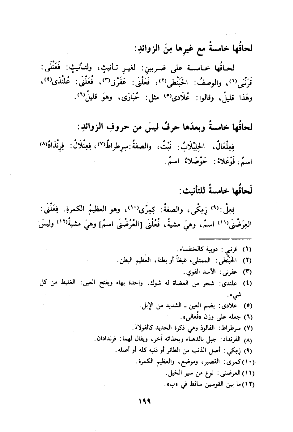 لحاقُها خامسة على ضربين: لغيرِ تأنيثٍ ولتأنيثٍ: فَعَنْلَى قَرْنْبَى1 والوصفُ: الحَبَنْطى2 فَعَلْنَى: عَفَرْنى3 فَعَلْنَى: عُلنْدَى4 وهَذا قليلٌ وقالوا: عُلاَدى5 مثل: حُبَارَى وهوَ قليلٌ6.