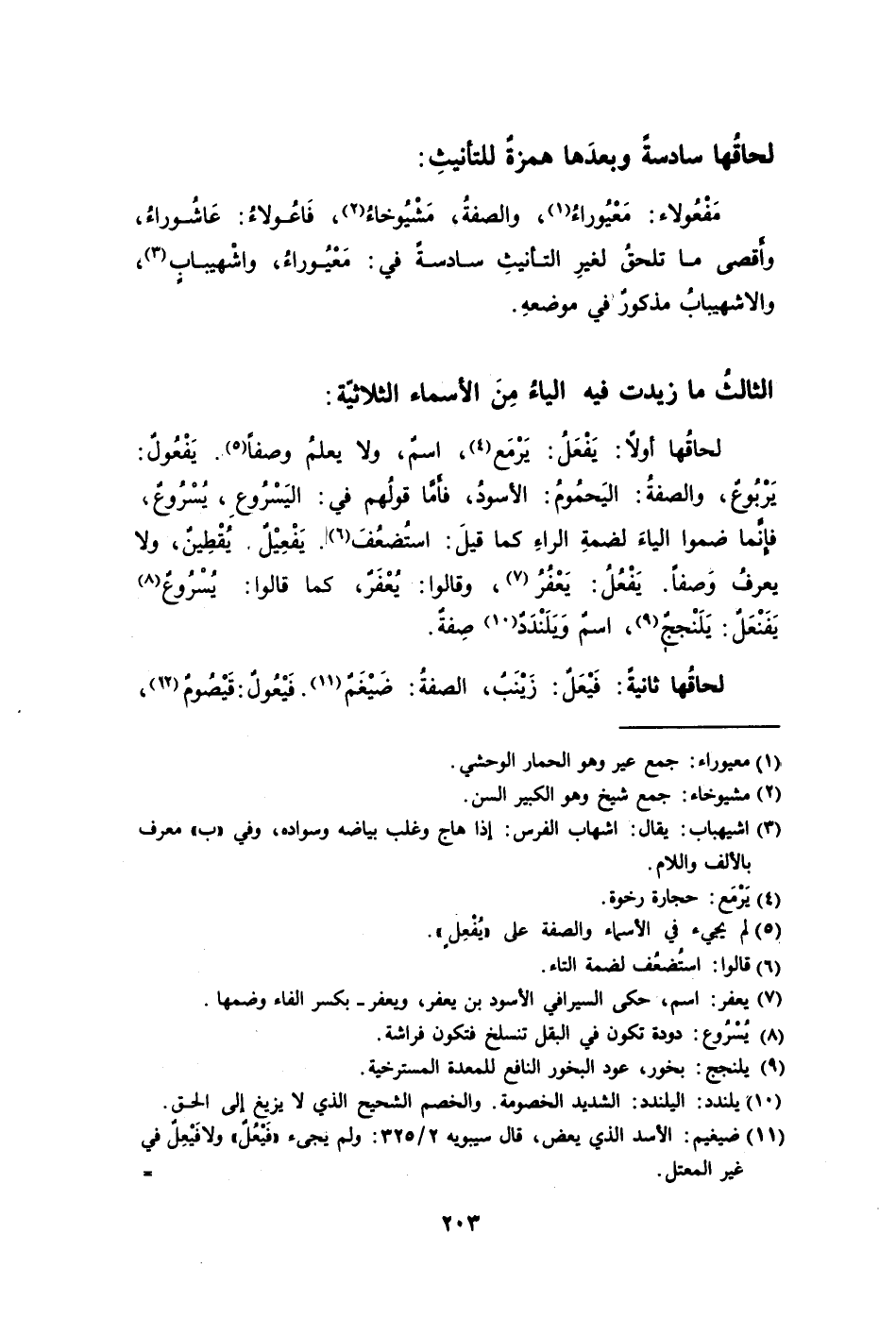 لحاقُها أولًا: يَفْعَلُ: يَرْمَع1، اسمٌ ولا يعلمُ وصفاً2، يَفْعُولٌ: يَرْبُوعٌ والصفةُ: اليَحمُومُ: الأسودُ فَأمَّا قولُهم في: اليَسْرُوعِ يُسْرُوعٌ فإِنَّما ضموا الياءَ لضمةِ الراءِ كما قيلَ: استُضعُفَ3. يَفْعِيْلٌ يُقْطِينٌ ولا يعرفُ وصفًا. يَفْعُلُ: يَعْفُرُ4 وقالوا: يُعْفَرٌ كما قالوا: يُسْرُوعٌ5 يَفَنْعَلٌ: يَلَنْججٌ6 اسمٌ وَيَلَنْدَدٌ7 صَفةٌ