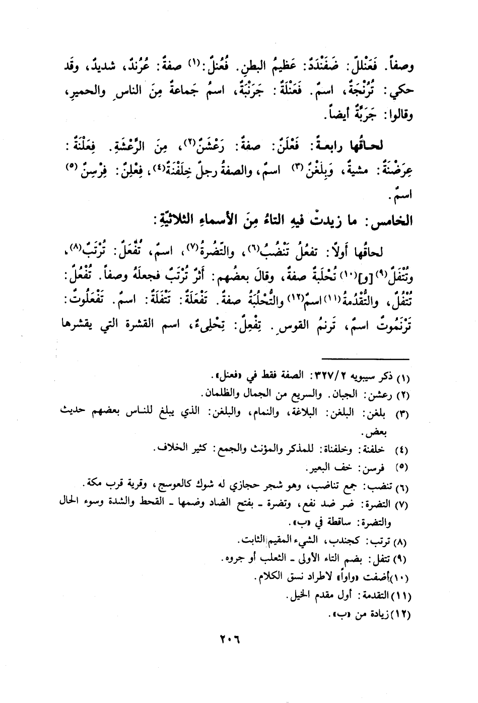 لحاقُها أَولًا: تفعُلُ تَنْضُبُ1 والتّضُرةُ2 اسمٌ تُفْعَلٌ: تُرْتَبٌ3 وتُتْفَلٌ4 [و] 5 تُحْلَبةٌ صفةٌ وقالَ بعضُهم: أَثرٌ تُرْتَبٌ فجعلَهُ وصفًا. تُفْعُلٌ: تُتْفُلٌ والتُّقْدُمةُ6 اسمٌ7 والتُّحْلُبَةُ صفةٌ. تَفْعَلَةٌ: تَتْفَلَةٌ: اسمٌ. تَفْعَلُوتٌ: تَرْنَمُوتٌ اسمٌ تَرنمُ القوسِ. تِفْعِلٌ: تِحْلِىءٌ اسم القشرة التي يقشرها