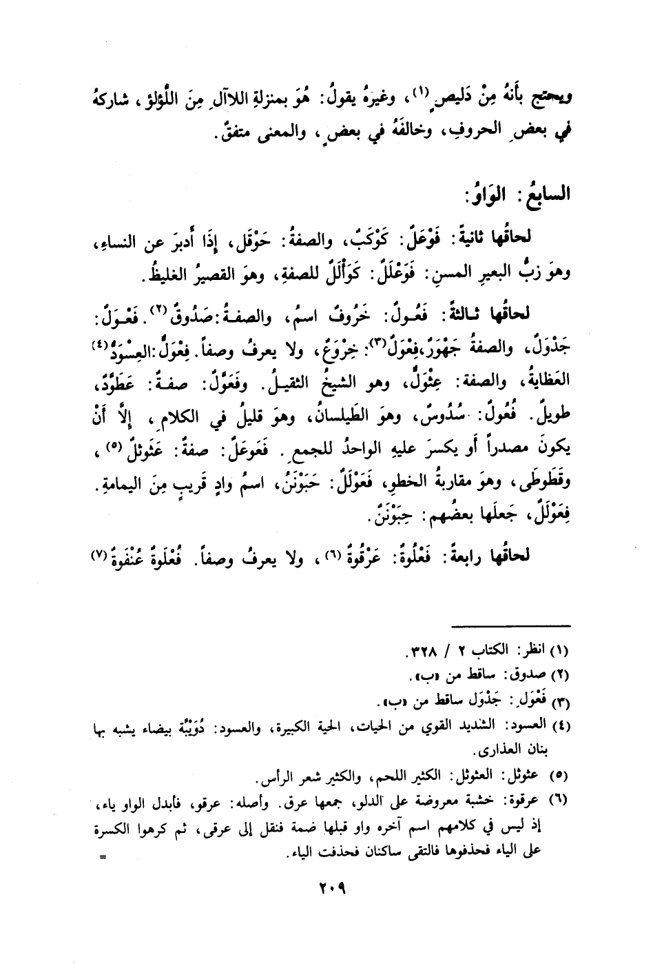 لحاقُها ثالثةً: فَعُولٌ: خَرُوفٌ اسمٌ والصفةُ: صَدُوقٌ2. فَعْوَلٌ: جَدْوَلٌ والصفةُ جَهْوَرٌ فِعْوَلٌ3: خِرْوَعٌ ولا يعرفُ وصفًا. فِعْوَلٌ: العِسْوَدٌّ4 العَظايةُ والصفة: عِثْوَلٌّ وهو الشيخُ الثقيلُ. وفَعَوَّلٌ: صفةٌ: عَطَوَّدٌ طويلٌ. فُعُولٌ: سُدُوسٌ وهوَ الطَيلسانُ وهوَ قليلُ في الكلامِ إلا أَنْ يكونَ مصدرًا أَو يكسرَ عليهِ الواحدُ للجمعِ. فَعَوعَلٌ: صفةٌ: عَثَوثلٌ5، وقَطَوطَى مقاربةُ الخطوِ فَعَوْلَلٌ: حَبَوْنَنُ اسمُ وادٍ قريبٍ مِنَ اليمامةِ. فِعَوْلَلٌ جَعلَها بعضُهم: حِبَوْنَنٌ.