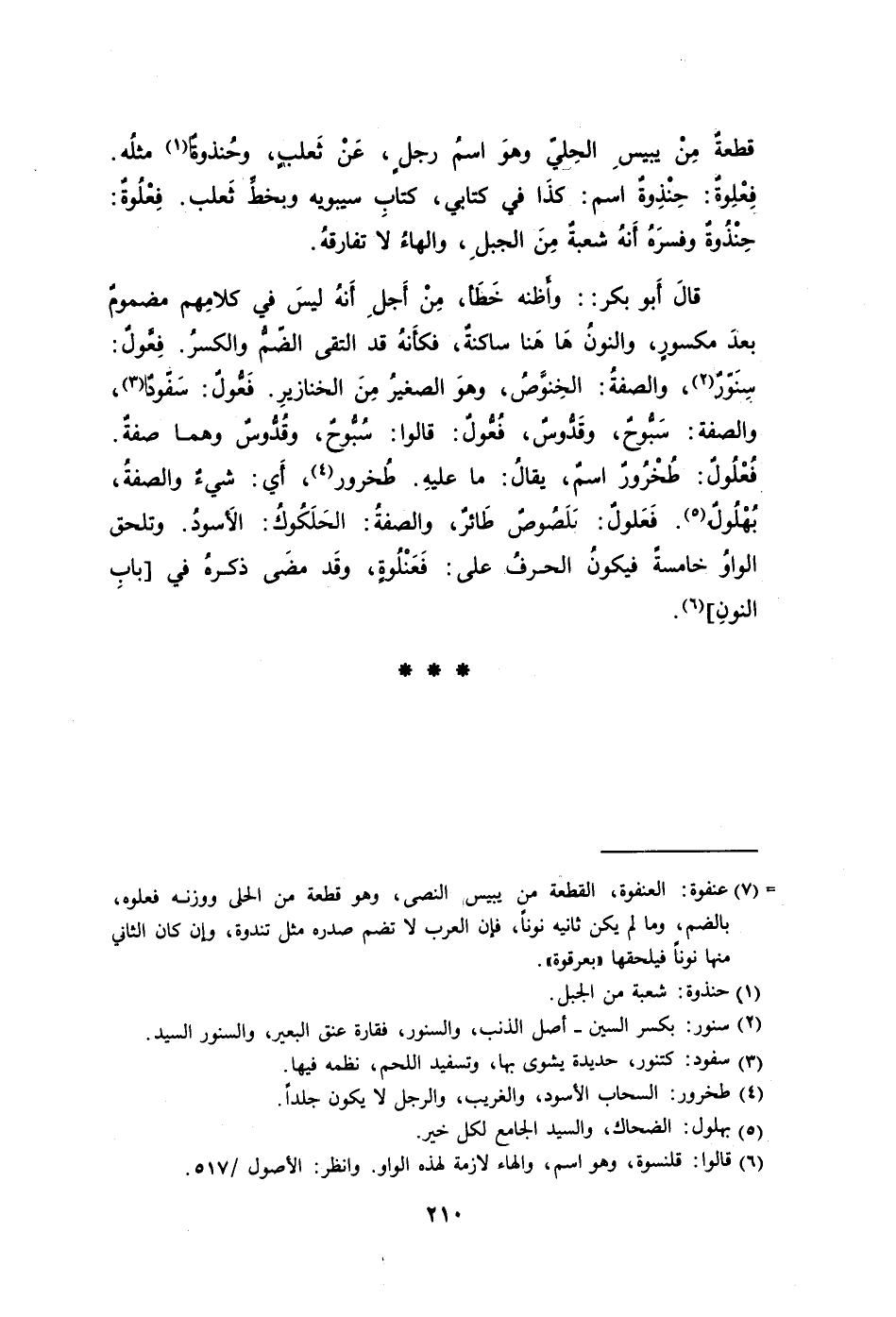 قالَ أَبو بكر: وأَظنه خَطَأ مِنْ أَجلِ أَنهُ ليسَ في كلامِهم مضمومٌ بعدَ مكسورٍ والنونُ هَهُنَا ساكنةٌ فكأنَهُ قد التقى الضّمٌّ والكسرُ. فِعَّولٌ: سِنَوّرٌ2، والصفةُ: الخِنوَّصُ وهوَ الصغيرُ مِنَ الخنازيرِ. فَعُّولٌ: سَفّودٌ3، والصفة: سَبُّوحٌ وقُدُّوسٌ فُعُّولٌ: قالوا: سُبُّوحٌ وقُدُّوسٌ وهما صفةٌ. فُعْلُولٌ: طُخْرُورٌ اسمٌ يقالُ: ما عليهِ. طُخرور4، أَي: شيءٌ والصفةُ بُهْلُولٌ5. فَعَلولٌ: بَلَصُوصٌ طَائرٌ والصفةُ: الحَلَكُوكُ: الأَسودُ. وتلحق الواوُ خامسةً فيكونُ الحرفُ على: فَعَنْلُوةٍ وقَد مضَى ذكرهُ في بابِ النونِ] 6.