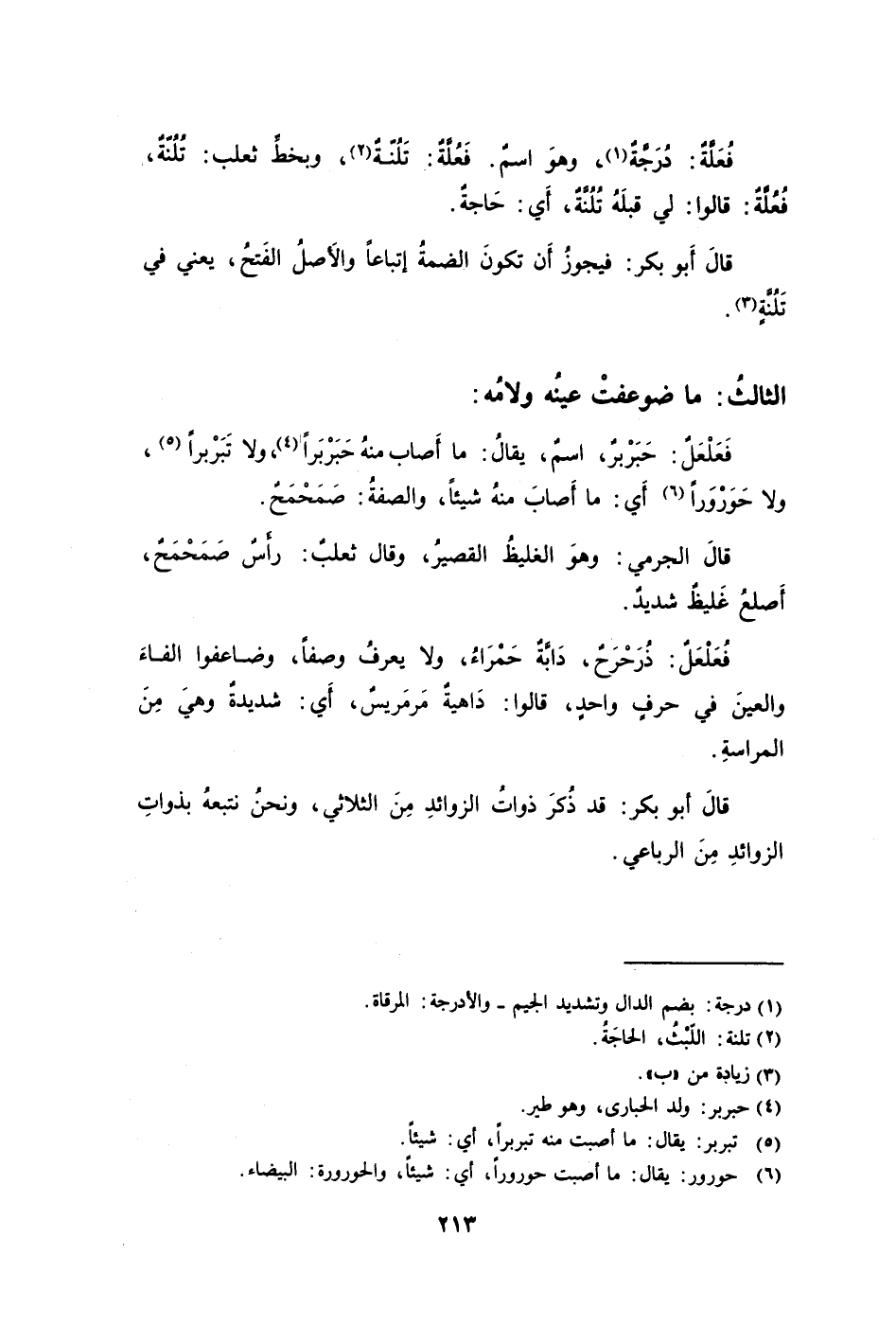 قالَ أَبو بكر: فيجوزُ أَن تكونَ الضمةُ إتباعًا والأَصلُ الفَتحُ يعني في تُلُنَّةٍ3.