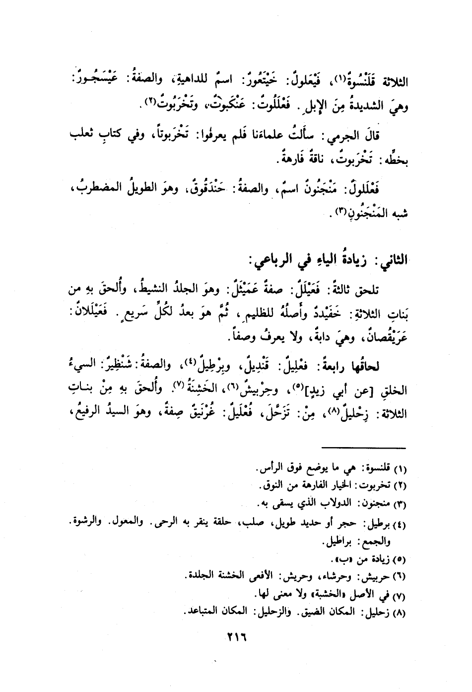 لحاقُها رابعةً: فعْلِيلٌ: قَنْدِيلٌ وبِرْطِيلٌ4، والصفةُ: شَنْظِيرٌ: السيءُ الخلقِ [عن أبي زيدٍ] 5، وحِرْبيشُ6 الخَشِنَةُ7. وأُلحقَ بهِ مِنْ بناتِ الثلاثة: زِحْليلٌ8، مِنْ: تَزَحَّلَ فُعْلَيلٌ: غُرْنَيقٌ صِفةٌ وهوَ السيدُ الرفيعُ.