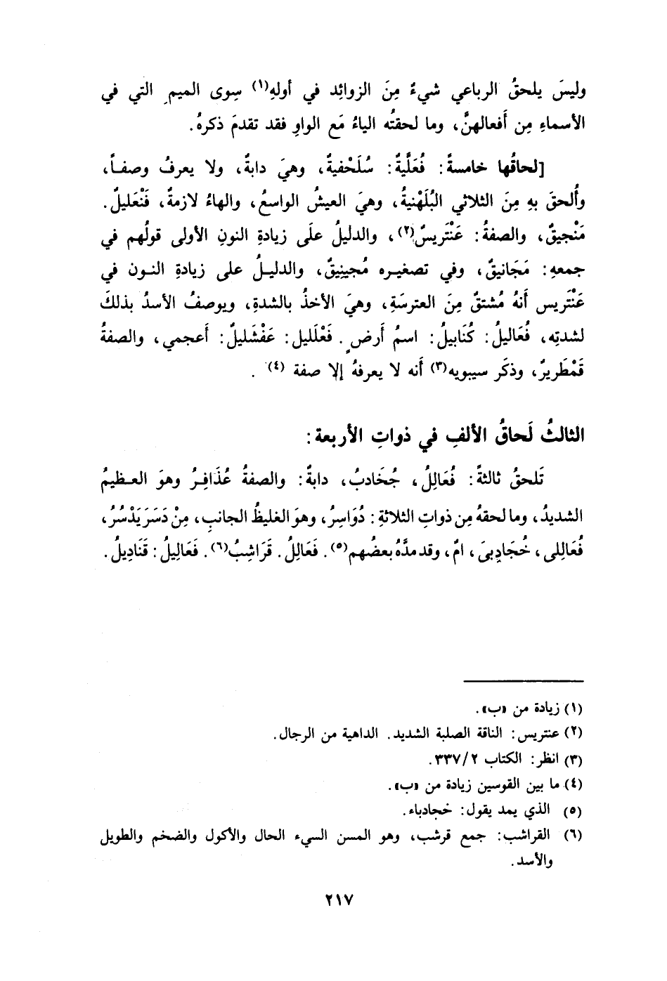 تَلحقُ ثالثةً: فُعَالِلُ جُخَادبُ دابةٌ: والصفةُ عُذَافِرُ وهوَ العظيمُ الشديدُ وما لحقهُ مِن ذواتِ الثلاثةِ دُوَاسِرُ وهوَ الغليظُ الجانبِ مِنْ دَسَرَ يَدْسُرُ فُعَالِلى خُجَادِبَى امٌ وقد مدَّهُ5 بعضُهم. فَعَالِلُ. قَرَاشِبُ6. فَعَالِيلُ: قَنَادِيلُ.