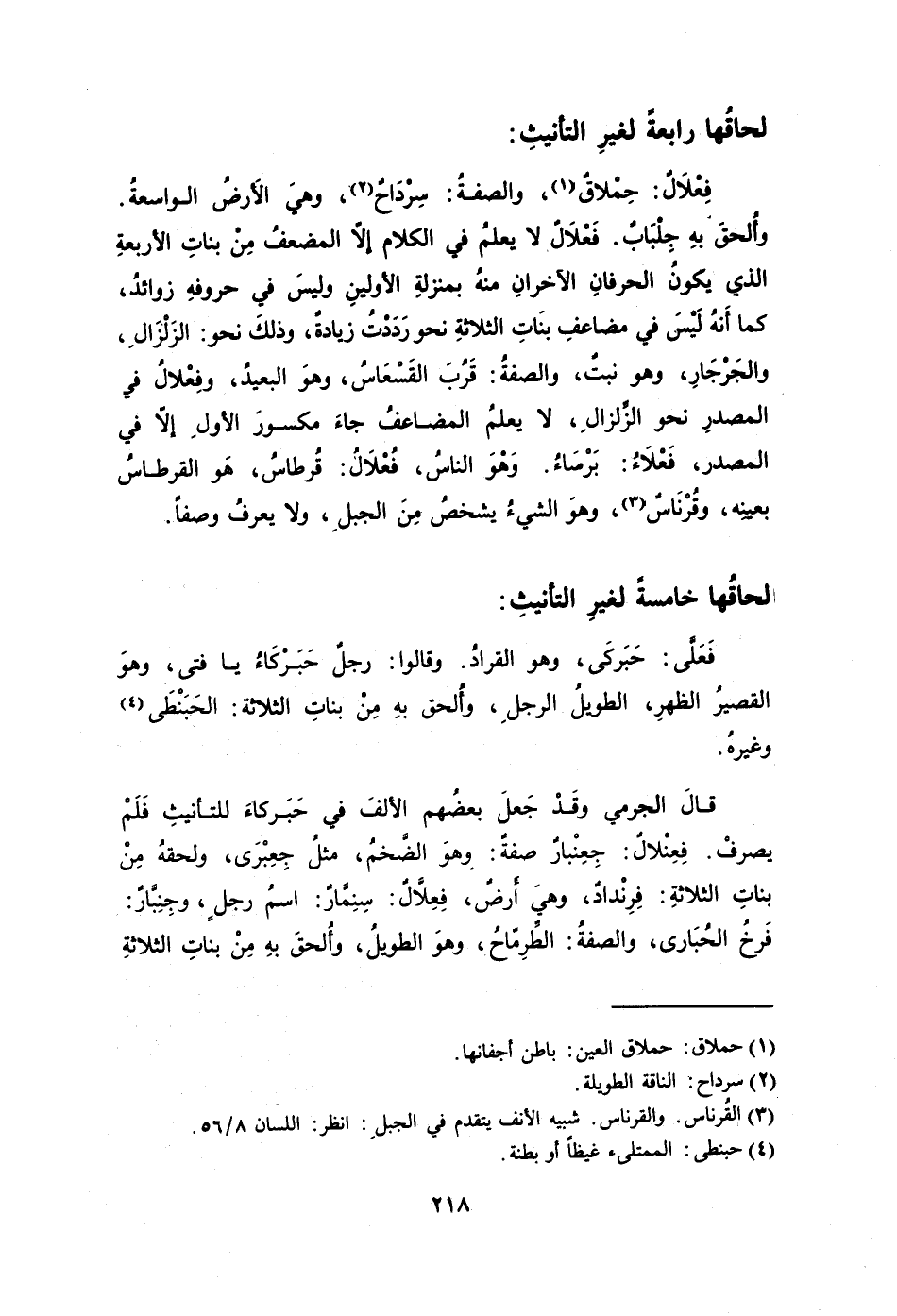 قالَ الجرمي وقَدْ جَعلَ بعضُهم الألفَ في حَبَركاءَ للتأنيثِ فَلَمْ يصرفْ. فِعِنْلالٌ: جِعِنْبارٌ صفةٌ: وهوَ الضَّخمُ مثلُ جِعِبْرَى ولحقُه مِنْ بناتِ الثلاثةِ: فِرِنْدادٌ وهيَ أَرضٌ فِعِلاَّلٌ: سِنِمَّارٌ: اسمُ رجلٍ وجِنِبَّارٌ: فَرخُ الحُبَارى والصفةُ: الطِّرْمّاحُ وهوَ الطويلُ وأُلحقَ بهِ مِنْ بناتِ الثلاثةِ