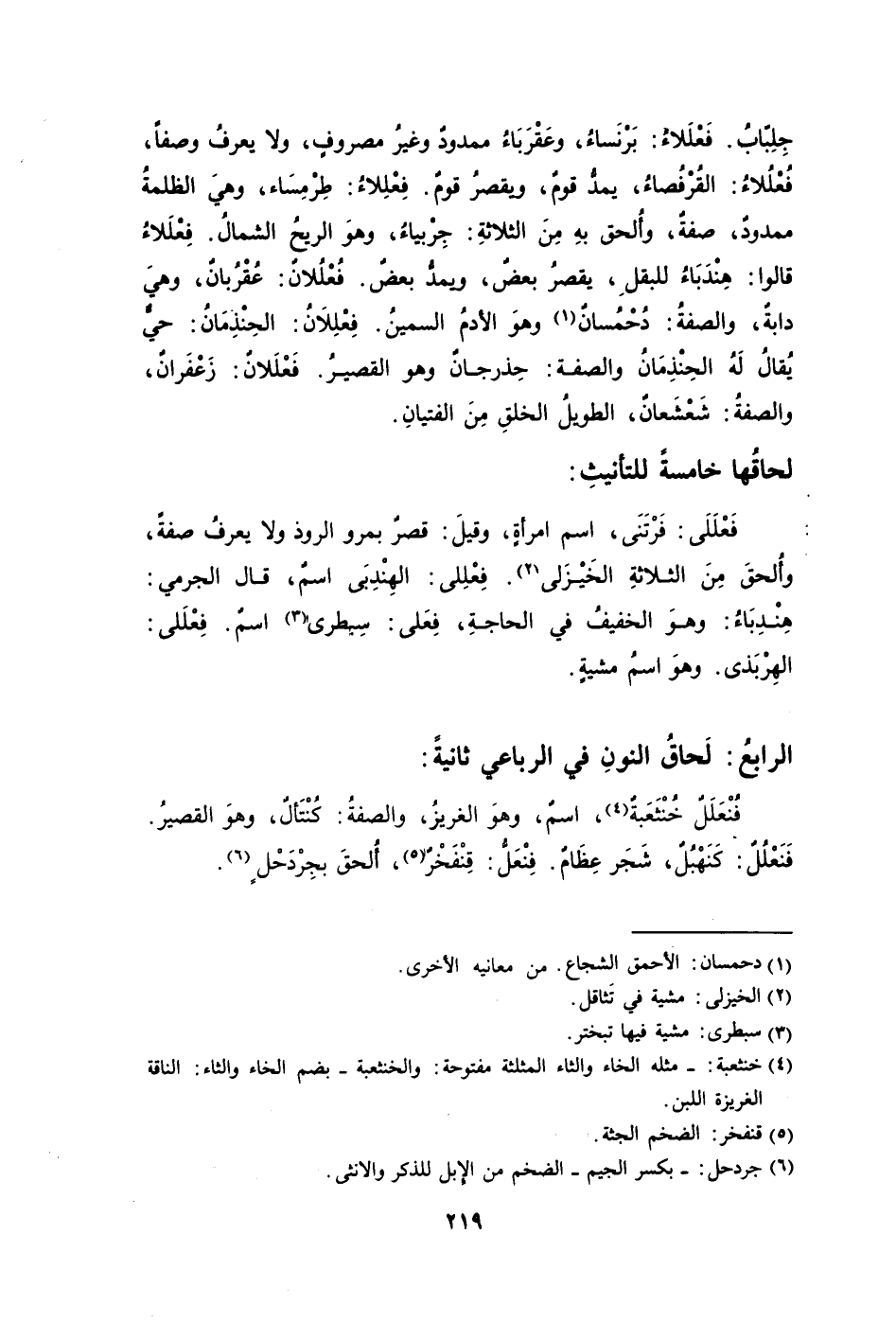 جِلِبّابُ. فَعْلَلاءُ: بَرْنَساءُ وعَقْرَبَاءُ ممدودٌ وغيرُ مصروفٍ ولا يعرفُ وصفًا فُعْلُلاءُ: القُرْفُصاءُ يمدُّ قومٌ ويقصرُ قومٌ. فِعْلِلاءُ: طِرْمِسَاءُ وهيَ الظلمةُ ممدودٌ صفةٌ وأُلحق بهِ مِنَ الثلاثةِ: جِرْبياءُ وهوَ الريحُ الشمالُ. فِعْلَلاءُ قالوا: هِنْدَبَاءُ للبقلِ يقصرُ بعضٌ ويمدُّ بعضٌ. فُعْلُلانٌ: عُقْرُبانٌ وهيَ دابةٌ والصفةُ: دُحْمُسانٌ1 وهوَ الأدمُ السمينُ. فِعْلِلانُ: الحِنْذِمَانُ حيٌّ يُقالُ لَهُ الحِنْذِمَانُ والصفة: حِذرجانٌ وهو القصيرُ. فَعْلَلانٌ: زَعْفَرانٌ والصفةُ: شَعْشَعانٌ الطويلُ الخلقِ مِنَ الفتيانِ.