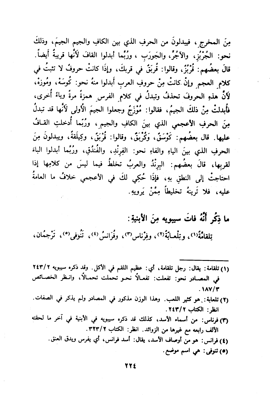 قال بعضُهم: كَوْسَقٌ وَكُرْبَقٌ وقالوا: قُرْبَقٌ وكِيلَقةٌ ويبدلونَ مِنَ الحرفِ الذي بينَ الياءِ والفاءِ نحو: الفِرِنْدِ والفُندُقِ ورُبَّما أبدلوا الباءَ لقربِها قالَ بعضُهم: البِرِنْدُ والعربُ تخلطُ فيما ليسَ من كلامِها إذا احتاجتْ إلى النطقِ بهِ فإذَا حُكِي لكَ في الأعجمي خلافُ ما العامةُ عليه فلا تَرينهُ تخليطًا مِمَّنْ يَرويهِ.