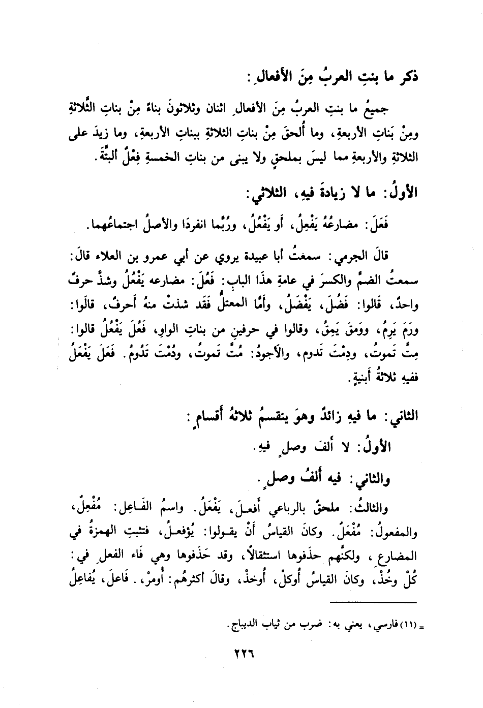 جميعُ ما بنتِ العربُ مِنَ الأفعالِ اثنان وثلاثونَ بناءً مِنْ بناتِ الثَّلاثةِ ومِنْ بَناتِ الأربعةِ وما أُلحقَ مِنْ بناتِ الثلاثةِ ببناتِ الأربعةِ وما زيدَ على الثلاثةِ والأربعةِ مما ليسَ بمحلقٍ ولا يبنى من بناتِ الخمسةِ فِعْلٌ ألبتَّةَ.