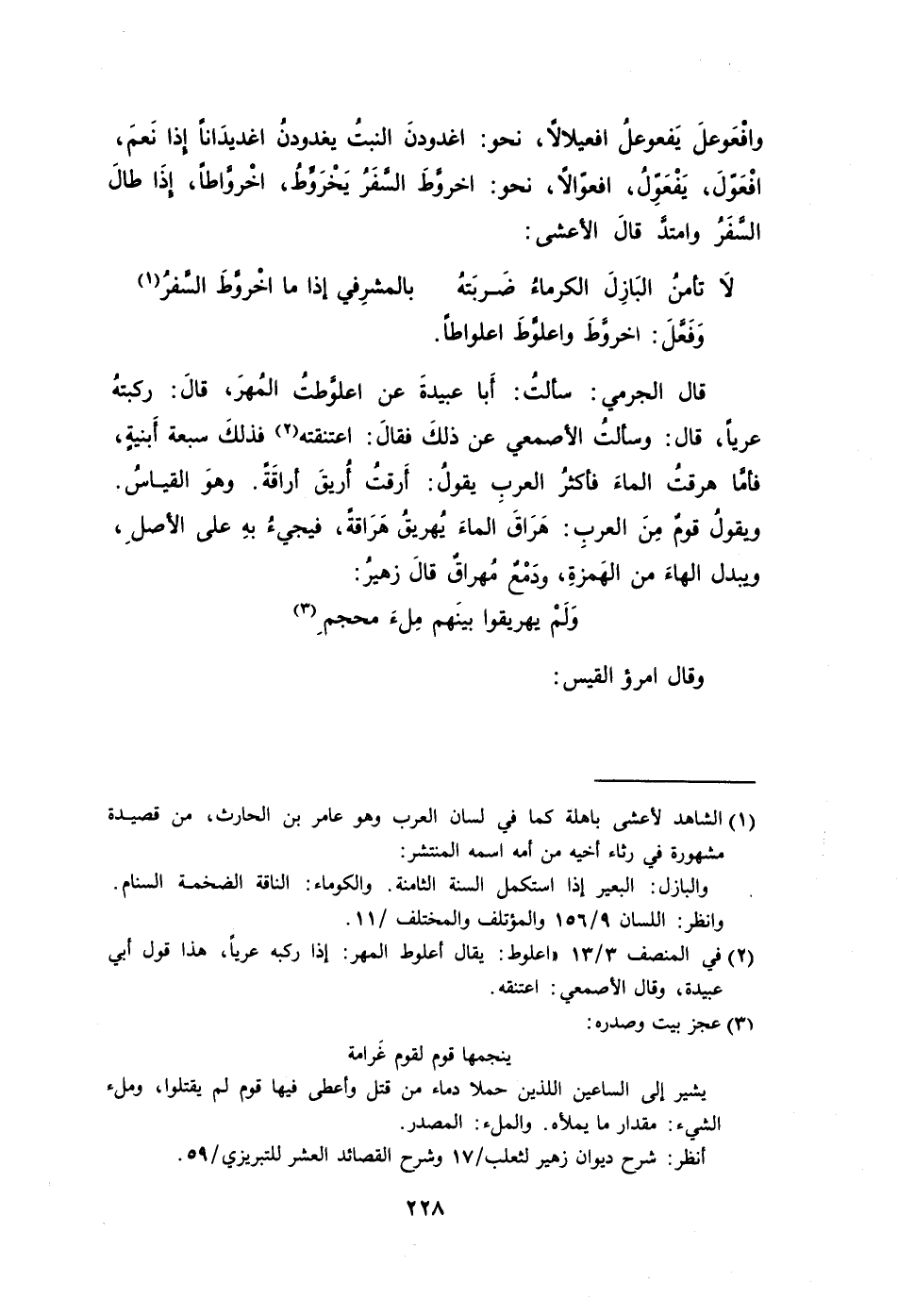 قال الجرمي: سألتُ: أَبا عبيدةَ عن اعلَّوطتُ المُهرَ قالَ: ركبتهُ عريًا قال: وسألتُ الأصمعي عن ذلكَ فقالَ: اعتنقته2 فذلكَ سبعة أَبنيةٍ فأمَّا هرقتُ الماءَ فأكثرُ العربِ يقولُ: أَرقتُ أُريقَ أراقَةً. وهوَ القياسُ. ويقولُ قومٌ مِنَ العربِ: هَرَاقَ الماءَ يُهريقُ هَرَاقةً فيجيءُ بهِ على الأصلِ ويبدل الهاءَِ من الهَمزةِ ودَمْعٌ مُهراقٌ قالَ زهيرُ: