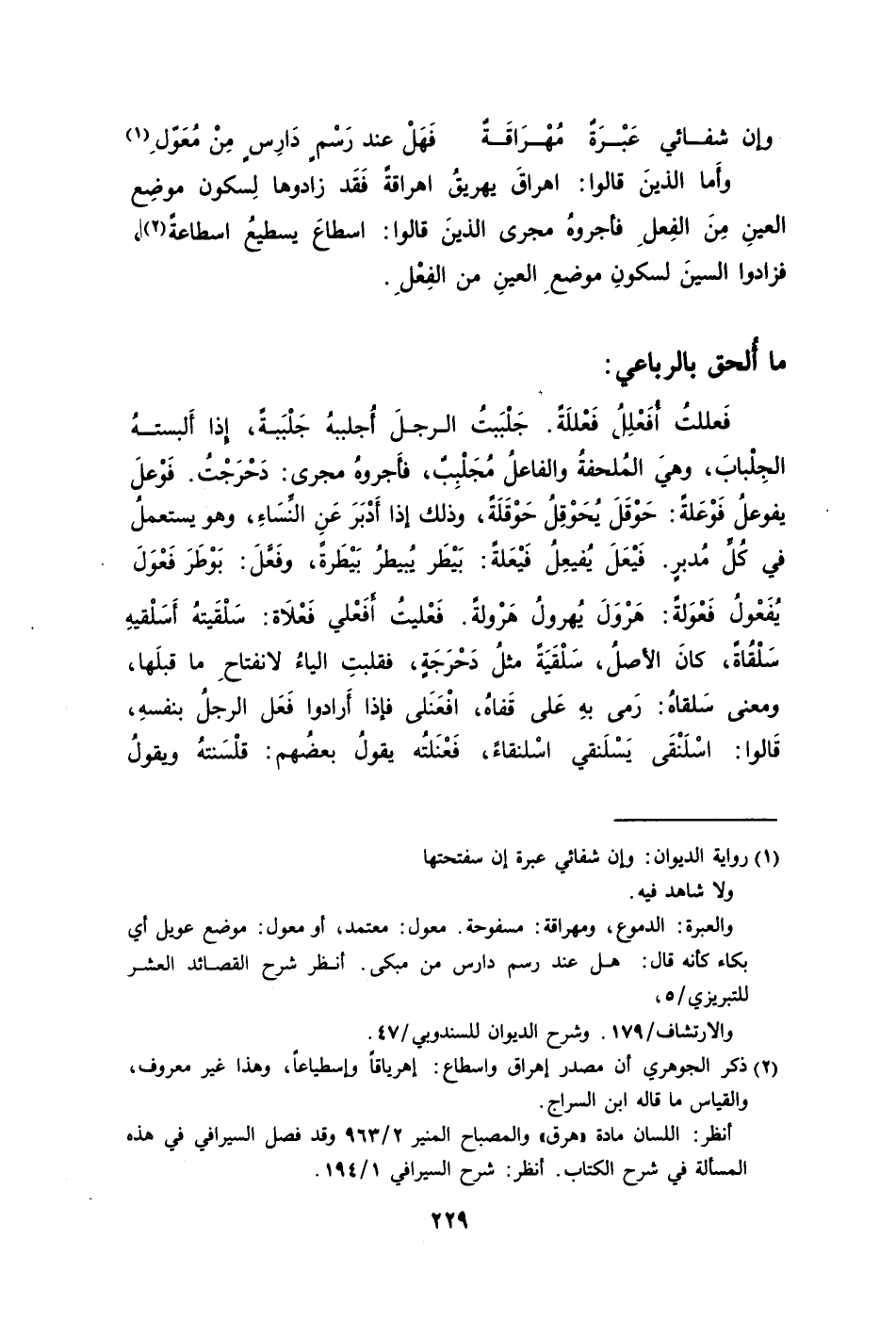 2 ذكر الجوهري أن مصدر اهراق واسطاع: اهرياقا واسطياعا، وهذا غير معروف، والقياس ما قاله ابن السراج.