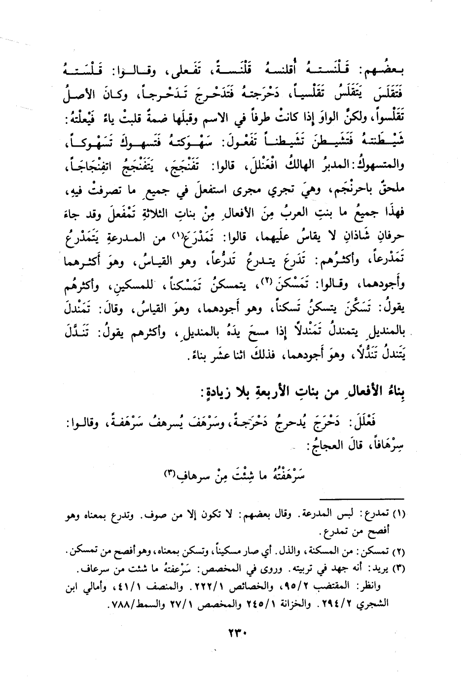 بعضُهم: قَلْنَستهُ أُقلنسةُ قَلْنَسةً تَفَعلى وقالوا: قَلْسَتهُ فَتَقَلَسَ يَتَقَلَسُ تَقَلْسيًا دَحْرَجتهُ فَتَدَحْرجَ تَدَحْرجًا وكانَ الأصلُ تَقَلْسوًا ولكنَّ الواوَ إِذا كانتْ طرفًا في الاسم وقبلَها ضمةٌ قلبتْ ياءً فَيْعلْتهُ: شَيْطَنتهُ فَتَشَيطنَ تَشَيطنًا تَفَعْولَ: سَهْوَكتهُ فَتَسهوكَ تَسْهُوكًا والمتسهوكُ: المدبرُ الهالكُ افْعَنْللَ قالوا: تَفَنْجَجَ يَتَفَنْجَجُ اتفِنْجَاجًَا ملحقٌ باحرنْجَم وهيَ تجري مجرى استفعلَ في جميعِ ما تصرفتْ فيهِ فهذَا جميعُ ما بنتِ العربُ مِنَ الأفعالِ مِنْ بناتِ الثلاثةِ تَمْفَعلَ وقد جاءَ حرفانِ شَاذانِ لا يقاسُ علَيهما قالوا: تَمَدْرَعَ1 من المدرعةِ يَتَمَدْرعُ تَمَدْرعًا وأكثرُهم: تَدَرعَ يتدرعُ تَدرُّعًا وهو القياسُ وهوَ أَكثرهما وأَجودهما وقالوا: تَمَسْكنَ2 يتمسكنُ تَمَسْكنًا للمسكينِ وأكثرهُم يقولُ: تَسَكَّنَ يتسكنُ تِسكنًا وهو أَجودهما وهوَ القياسُ وقالَ: تَمَنْدلَ بالمنديلِ يتمندلُ تَمَنْدلًا إِذا مسحَ يدَهُ بالمنديلِ وأكثرهم يقولُ: تَنَدَّلَ يَتَندلُ تَنَدُّلًا وهوَ أَجودهما فذلكَ اثنا عشرَ بناءً.