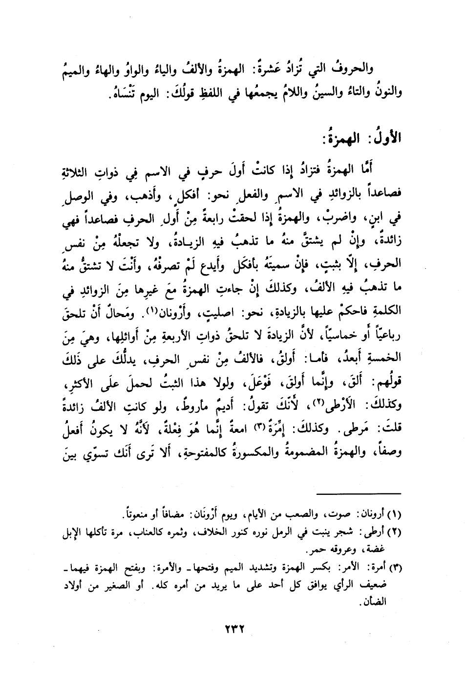 أَمَّا الهمزةُ فتزادُ إِذا كانتْ أَولَ حرفٍ في الاسم فِي ذواتِ الثلاثةِ فصاعدًا بالزوائدِ في الاسم والفعلِ نحو: أفكلٍ وأَذهب وفي الوصلِ في ابنٍ واضربْ والهمزةُ إِذا لحقتْ رابعةً مِنْ أَولِ الحرفِ فصاعدًا فهي زائدةٌ وإِنْ لم يشتقَّ منهُ ما تذهبُ فيهِ الزيادةُ ولا تجعلْهُ مِنْ نفسِ الحرفِ إلا بثبتٍ فإِنْ سميتَهُ فأفكَل وأَيدع لَمْ تصرفْهُ وأَنْتَ لا تشتقُّ منهُ ما تذهبُ فيهِ الألفُ وكذلكَ إِنْ جاءتِ الهمزةُ معَ غيرِها مِنَ الزوائدِ في الكلمةِ فاحكمْ عليها بالزيادةِ نحو: اصليتٍ وأَرْونان1. ومَحالٌ أَنْ تلحقَ رباعيًّا أَو خماسيًّا لأنَّ الزيادةَ لا تلحقُ ذواتِ الأربعةِ مِنْ أَوائلِها وهيَ مِنَ الخمسةِ أَبعدُ فأما: أَولقُ فالألفُ مِنْ نفسِ الحرفِ يدلُّكَ على ذَلكَ قولُهم: أَلقَ وإِنَّما أَولقَ فَوْعَلَ ولولا هذا الثبتُ لحملَ علَى الأكثرِ وكذلكَ: الأَرْطى2، لأَنّكَ تقولُ: أَديمٌ مأروطٌ ولو كانتِ الألفُ زائدةً قلتَ: مَرطى. وكذلكَ: إِمِّرَةٌ3 أمعةٌ إِنَّما هُوَ فِعْلةٌ لأَنَّهُ لا يكونُ أَفعلُ وصفًا والهمزةُ المضمومةُ والمكسورةُ كالمفتوحةِ أَلا تَرى أَنَك تسوّي بينَ