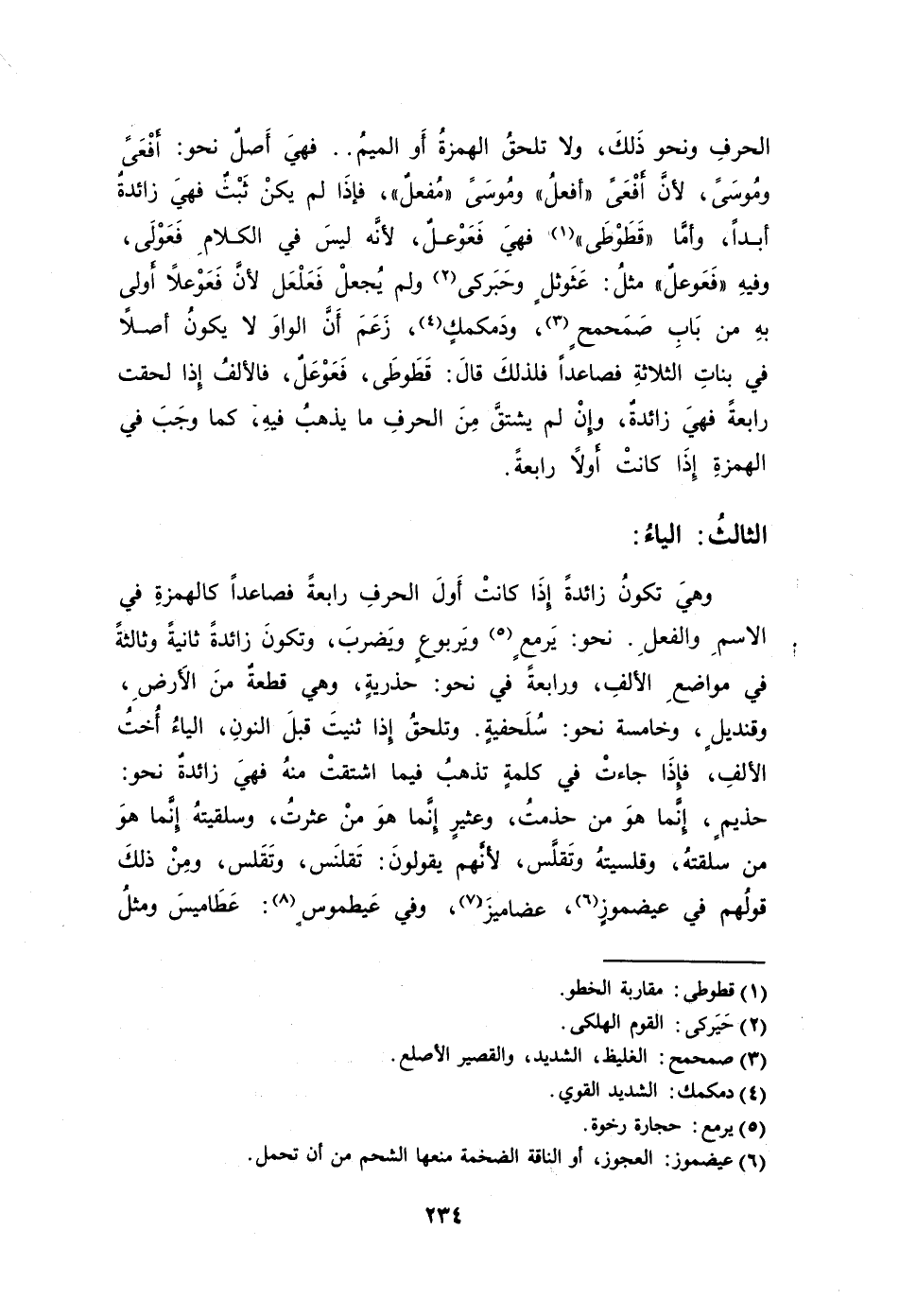 وهيَ تكونُ زائدةً إِذَا كانتْ أولَ الحرفِ رابعةً فصاعدًا كالهمزةِ في الاسم والفعلِ. نحو: يَرمعٍ5 ويَربوعٍ ويَضربَ وتكونَ زائدةً ثانيةً وثالثةً في مواضعِ الألفِ ورابعةً في نحو: حذريةٍ وهي قطعةٌ منَ الأَرضِ وقنديلٍ وخامسة نحو: سُلَحفيةٍ. وتلحقُ إِذا ثنيتَ قبلَ النونِ الياءُ أُختُ الألفِ فإِذاَ جاءتْ في كلمةٍ تذهبُ فيما اشتقتْ منهُ فهيَ زائدةٌ نحو: حذيمٍ إِنَّما هوَ من حذمتُ وعثيرٍ إِنَّما هوَ منْ عثرتُ وسلقيتهُ إِنَّما هوَ من سلقتهُ وقلسيتهُ وتَقلَّس لأنَّهم يقولونَ: تَقلنَس وتَقَلس ومِنْ ذلكَ قولُهم في عيضموزٍ6 عضاميزَ7 وفي عَيطموسٍ8: عَطَاميسَ ومثلُ