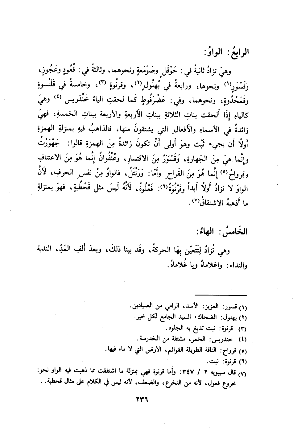 وهيَ تزادُ ثانيةً في: حَوْقَلٍ وصَوْمَعةٍ ونحوهما وثالثةً في: قُعودٍ وعَجُوزٍ وَقَسْوَرٍ1 ونحوها ورابعةً في بُهْلُولٍ2 وقرنُوةٍ3، وخامسةً في قَلَنْسوةٍ وقَمَحْدُوةٍ ونحوهما وفي: عَضْرَفُوطٍ كَما لحقتِ الياءُ خَنْدَريس4 وهيَ كالياءِ إِذَا أَلحقت بناتِ الثلاثةِ ببناتِ الأَربعةِ والأربعة ببناتِ الخمسةِ فهيَ زائدةٌ في الأسماءِ والأَفعالِ التي يشتقونَ منها فالذاهبُ فيهِ بمنزلةِ الهمزةِ أَولًا أَن يجيء ثَبْت وهوَ أَولى أَنْ تكونَ زائدةً مِنَ الهمزةِ قالوا: جَهْوَرْتُ وإِنَّما هيَ مِنَ الجَهارةِ وَقَسْوَرٌ مِنَ الاقتسارِ وعُنْفُوانٌ إِنَّما هُوَ مِنَ الاعتنافِ وقِرواحٌ5 إِنَّما هُوَ مِنَ القَراحِ وأَمّا: وَرَنْتَلٌ فالواوُ مِنْ نفسِ الحرفِ لأَنَّ الواوَ لا تزادُ أَولًا أبدًا وقَرْنُوَةٌ6: فَعْلَوةٌ لأَنَّهُ لَيسَ مثل قُحْطُبةٍ فهوَ بمنزلةِ ما أَذهبهُ الاشتقاقُ7.