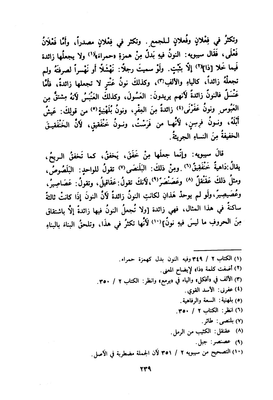 قالَ سيبويه: وإنّما جعلَها مِنْ خَفَقَ يَخفقُ كما تَخفقُ الريحُ يقالُ: دَاهيةٌ خَنْفَقِيقٌ6. ومِنْ ذلكَ: البَلَنصَى7 تقولُ للواحدٍ: البَلَصُوصُ ومثلُ ذلكَ عَقَنْقلٌ8 وعَصَنْصَرٌ9 لأَنكَ تقولُ: عَقَاقيلُ وتقولُ: عَصَاصِيرُ وعُصَيصِيرٌ ولَو لم يوحدْ هَذانِ لكانتِ النونُ زائدةً لأَنَّ النونَ إذَا كانتْ ثالثةً ساكنةً في هذا المثال فهي زائدة [ولا تُجعلُ النونُ فيها زائدةً إلا باشتقاق مِنَ الحروفِ ما ليسَ فيهِ نونٌ] 10 لأَنَّها تكثرُ في هذَا وتلحقُ البناءَ بالبناءِ