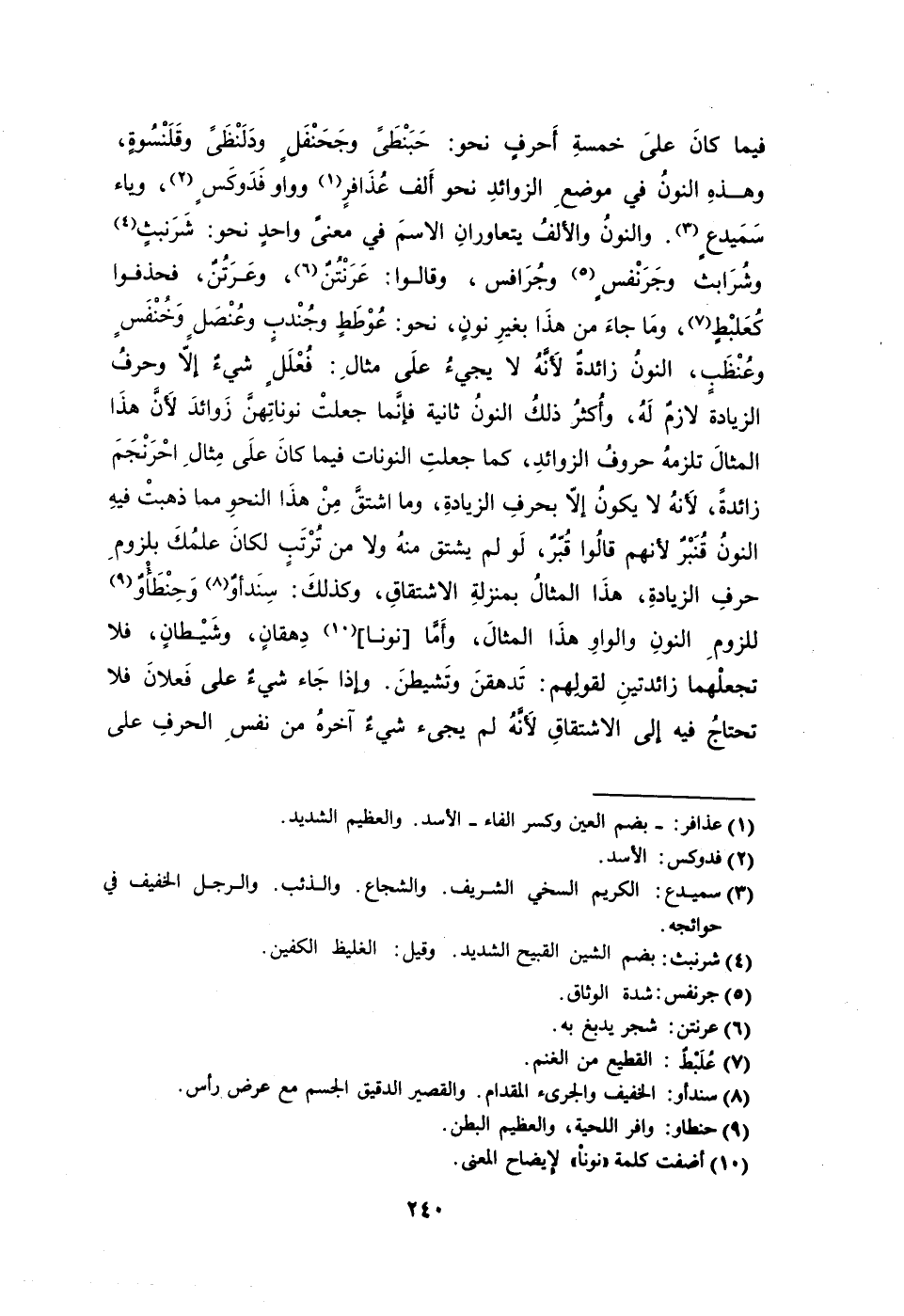 فيما كانَ علَى خمسةِ أَحرفٍ نحو: حَبَنْطَىً وجَحَنْفَلٍ ودَلَنْظَىً وقَلَنْسُوةٍ وهذِه النونُ في موضعِ الزوائدِ1 نحو أَلف عُذَافرٍ وواو فَدَوكَسٍ2، وياء سَمَيدعٍ3. والنونُ والألفُ يتعاورانِ الاسمَ في معنىً واحدٍ نحو: شَرَنبثٍ4 وشُرابث وجَرَنْفسٍ5 وجُرَافس وقالوا: عَرَنْتُنٌ6، وعَرَتُنٌ فحذفوا كُعَلبْطٍ7 ومَا جاءَ من هذَا بغيرِ نونٍ نحو: عُوطَطٍ وجُنْدبٍ وعُنْصَلٍ وَخُنْفَسٍ وعُنْظَبٍ النونُ زائدةٌ لأَنَّهُ لا يجيءُ علَى مثالِ: فُعْلَلٍ شيءٌ إلا وحرفُ الزيادة لازمٌ لَهُ وأُكثرُ ذلكُ النونُ ثانية فإنَّما جعلتْ نوناتِهنَّ زَوائدَ لأَنَّ هذَا المثالَ تلزمهُ حروفُ الزوائدِ كما جعلتِ النونات فيما كانَ علَى مِثالِ احْرَنْجَمَ زائدةً لأَنهُ لا يكونُ إلا بحرفِ الزيادةِ وما اشتقَّ مِنْ هذَا النحوِ مما ذهبتْ فيهِ النونُ قُنَبْرٌ لأنهم قالُوا قُبّرٌ لَو لم يشتق منهُ ولا من تُرْتَبٍ لكانَ علمُكَ بلزومِ حرفِ الزيادةِ هذَا المثالُ بمنزلةِ الاشتقاقِ وكذلكَ: سِنَدأوٌ8 وَحِنْطَأْوٌ9 للزومِ النونِ والواوِ هذَا المثالَ وأَمَّا [نونا] 10 دِهقانٍ وشَيْطانٍ فلا تجعلْهما زائدتينِ لقولِهم: تَدهقنَ وتَشيطنَ. وإذا جَاء شيءٌ على فَعلانَ فلا تحتاج فيه إلى الاشتقاقِ لأَنَّهُ لم يجىء شيءٌ آخرهُ من نفسِ الحرفِ على