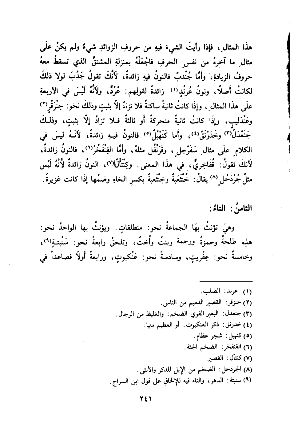 هذا المثالِ فإذا رأيتَ الشيءَ فيهِ من حروفِ الزوائدِ شيءٌ ولم يكنْ علَى مثالِ ما آخرهُ من نفسِ الحرفِ فاجْعَلْهُ بمنزلةِ المشتقِّ الذي تسقطُ معهُ حروفُ الزيادةِ وأَمَّا جُنْدبٌ فالنونُ فيهِ زائدةٌ لأَنَّكَ تقولُ جَدُبَ لولا ذلكَ لكانتْ أَصلًا ونونُ عُرنُدٍ1 زائدةٌ لقولِهم: عُرُدٌّ ولأَنَّهُ لَيْسَ في الأربعةِ علَى هذَا المثالِ وإذَا كانتْ ثانيةً ساكنةً فلا تزادُ إلا بثبتٍ وذلكَ نحو: حِنْزَقْرٍ2 وعَنْدَليبٍ وإذَا كانتْ ثانيةً متحركةً أَو ثالثةً فلا تزادُ إلا بثبتٍ وذلكَ جَنَعْدَلٌ3 وخَدَرْنَقٌ4 وأَما كَنَهْبُلٌ5 فالنونُ فيهِ زائدةٌ لأَنَهُ ليسَ في الكلامِ علَى مثالِ سَفَرْجلٍ وقَرَنْفُل مثلهُ وأَمَّا القَنْفَخْرُ6، فالنونُ زائدةٌ لأَنكَ تقولُ: قُفَاخِريٌّ في هذَا المعنى. وكِنْتَأْلٌ7 النونُ زائدةٌ لأَنَّهُ لَيْسَ مُثلُ جُرْدَحْلٍ8 يقالُ: خُنْثَعَبةٌ وخِنْثَعبةٌ بكسرِ الخاءِ وضمُها إذَا كانت غزيرةٌ.