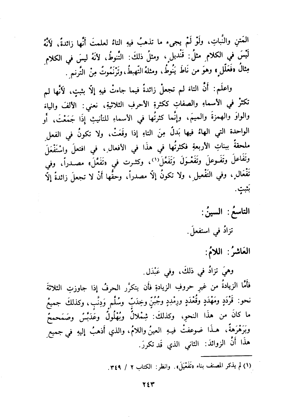 واعلَم: أَنَّ التاءَ لم تجعلْ زائدةً فيما جاءتْ فيهِ إلا بثبتٍ لأَنَّها لم تكثرْ في الأسماءِ والصفاتِ ككثرةِ الأحرفِ الثلاثيةِ نعني: الألفَ والياءَ والواوَ والهمزةَ والميمَ وإِنَّما كثرتُها في الأسماءِ للتأنيثِ إِذَا جَمَعْتَ أَو الواحدة التي الهاءُ فيها بَدلٌ مِنَ التاءِ إذا وقَعَتْ ولا تكونُ في الفعلِ ملحقةً ببناتِ الأربعةِ فكثرتُها في هذَا في الأفعالِ في افتعلَ واسْتَفْعَلَ وتَفَاعلَ وتَفَوعلَ وتَفَعْوَلَ وَتَفَعَّلَ1 وكثرت في "تَفَعَّلَ" مصدرًا وفي تَفْعَالٍ وفي التَفْعيلِ ولا تكونُ إلا مصدرًا وحقُّها أَنْ لا تجعلَ زائدةً إلا بَثبتٍ.
