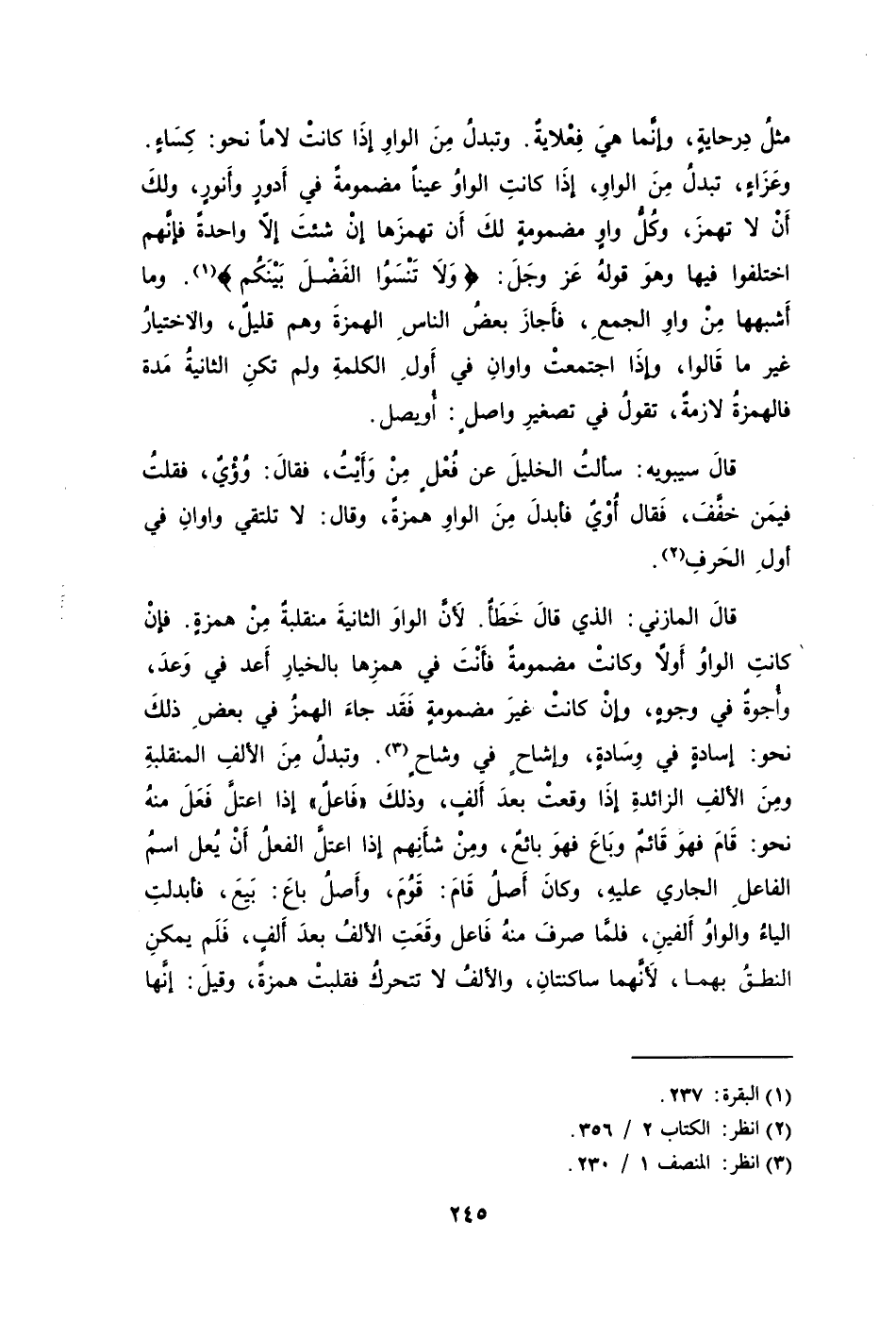 مثلُ دِرحايةٍ وإنَّما هيَ فِعْلايةٌ. وتبدلُ مِنَ الواوِ إذَا كانتْ لامًا نحو: كِسَاءٍ. وعَزَاءٍ تبدلُ مِنَ الواوِ إذَا كانتِ الواوُ عينًا مضمومةً في أَدورٍ وأَنورٍ ولكَ أَنْ لا تهمزَ وكُلُّ واوٍ مضمومةٍ لكَ أَن تهمزَها إنْ شئتَ إلا واحدةً فإنَّهم اختلفوا فيها وهوَ قولهُ عَز وجَلَ: {وَلا تَنْسَوُا الْفَضْلَ بَيْنَكُمْ} 1 وما أَشبهها مِنْ واوِ الجمعِ فأَجازَ بعضُ الناسِ الهمزةَ وهم قليلٌ والاختيارُ غير ما قَالوا وإذَا اجتمعتْ واوانِ في أَولِ الكلمةِ ولم تكنِ الثانيةُ مَدة فالهمزةُ لازمةٌ تقولُ في تصغيرِ واصلٍ: أُويصل.